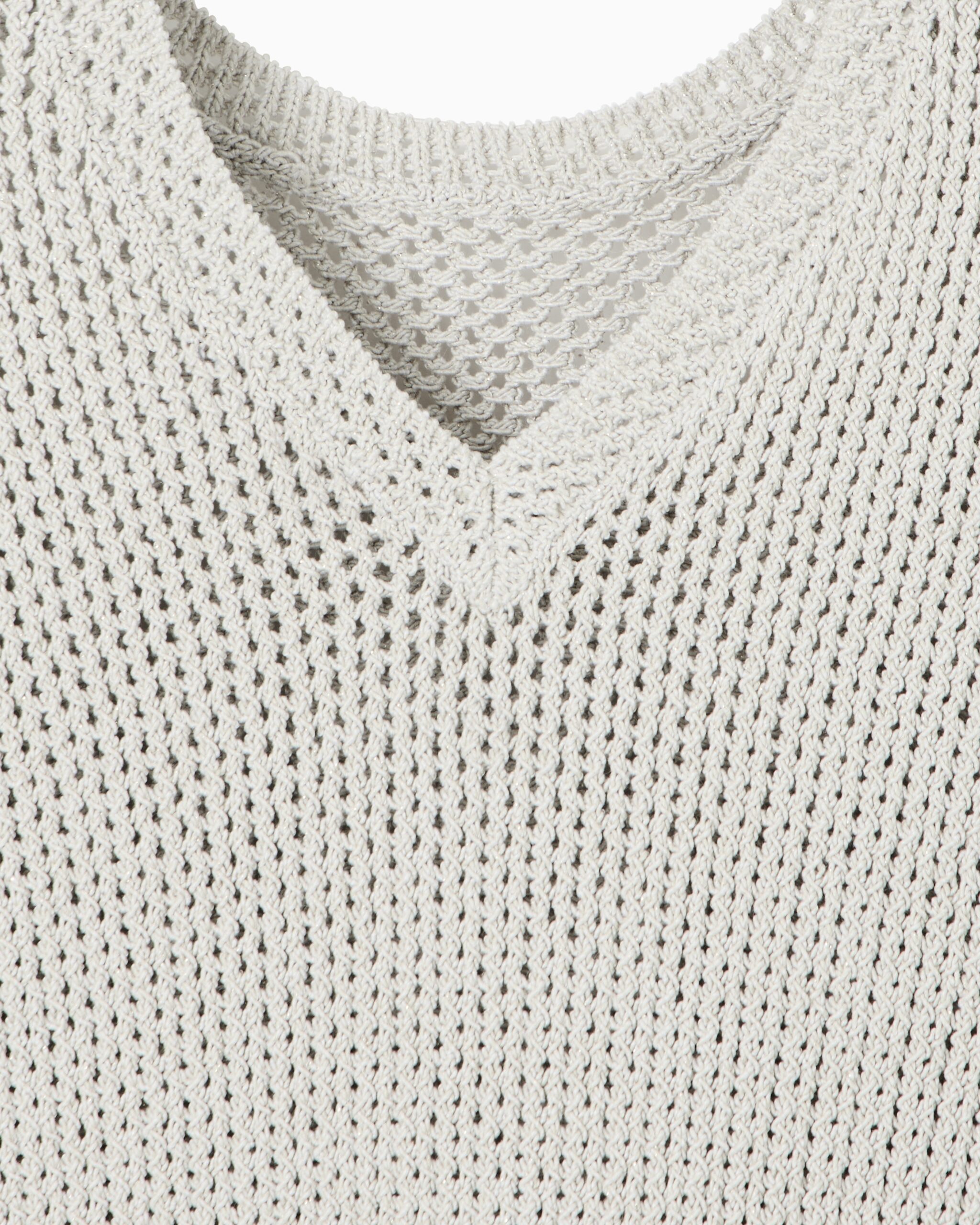 Μια αύρα εκλεπτυσμένης λάμψης περιβάλλει αυτό το μεταλλικό πλεκτό τοπ. Το φως χορεύει πάνω στις λαμπερές κλωστές, δημιουργώντας ένα ιριδίζον εφέ που αιχμαλωτίζει το βλέμμα. Η στρογγυλή λαιμόκοψη και η καθαρή σιλουέτα κολακεύουν τη σιλουέτα, ενώ η μεταλλική υφή προσθέτει μια πινελιά τολμηρής κομψότητας. Ιδανικό για να φωτίσετε μια ξεχωριστή βραδιά ή να προσθέσετε μια πινελιά πολυτέλειας στην καθημερινή σας εμφάνιση.