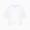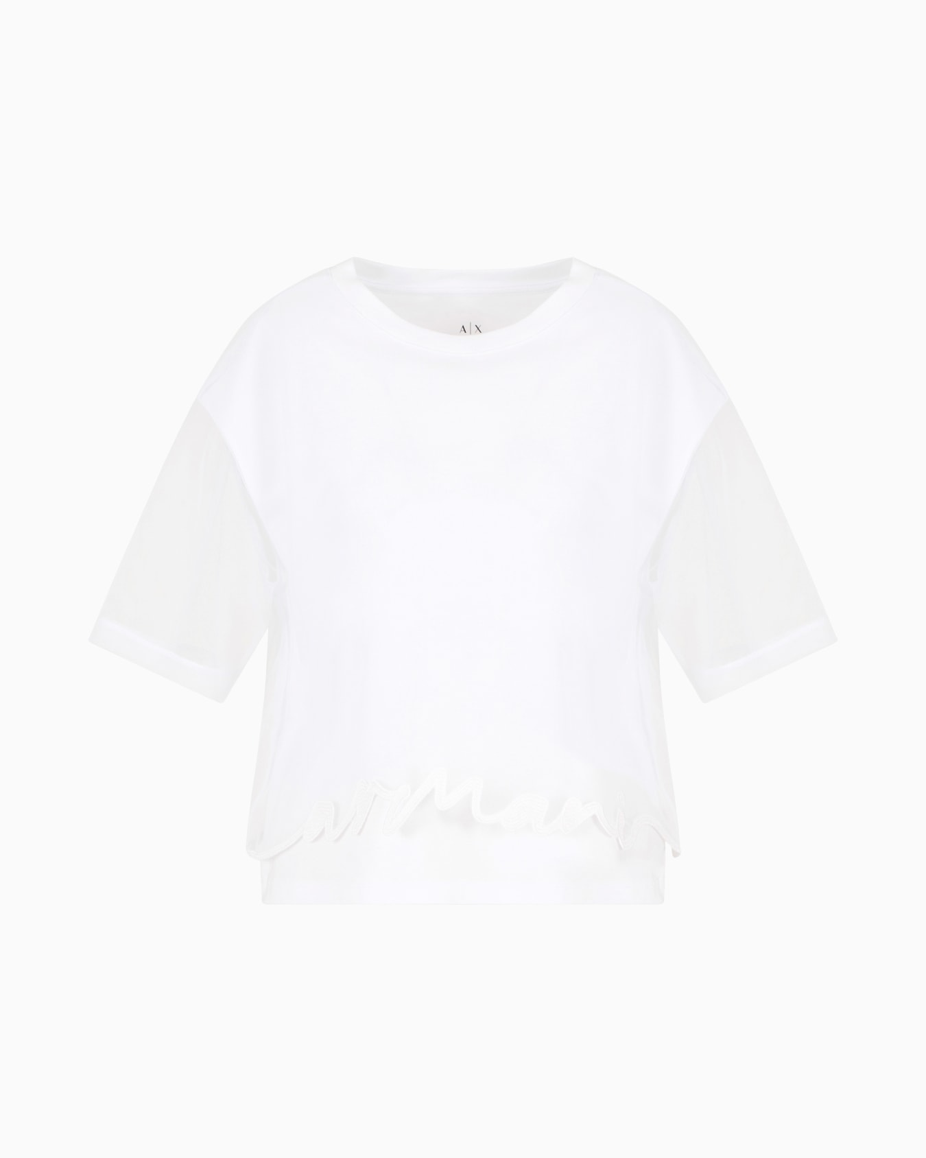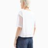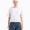 Μπλούζα από ζέρσεϊ με διαφανή μανίκια και στρογγυλή λαιμόκοψη, διακοσμημένη με το λογότυπο. Το κοντό σχέδιο και η στρογγυλή λαιμόκοψη προσδίδουν μια μοντέρνα και θηλυκή πινελιά, ιδανική για αστικές και σύγχρονες εμφανίσεις.