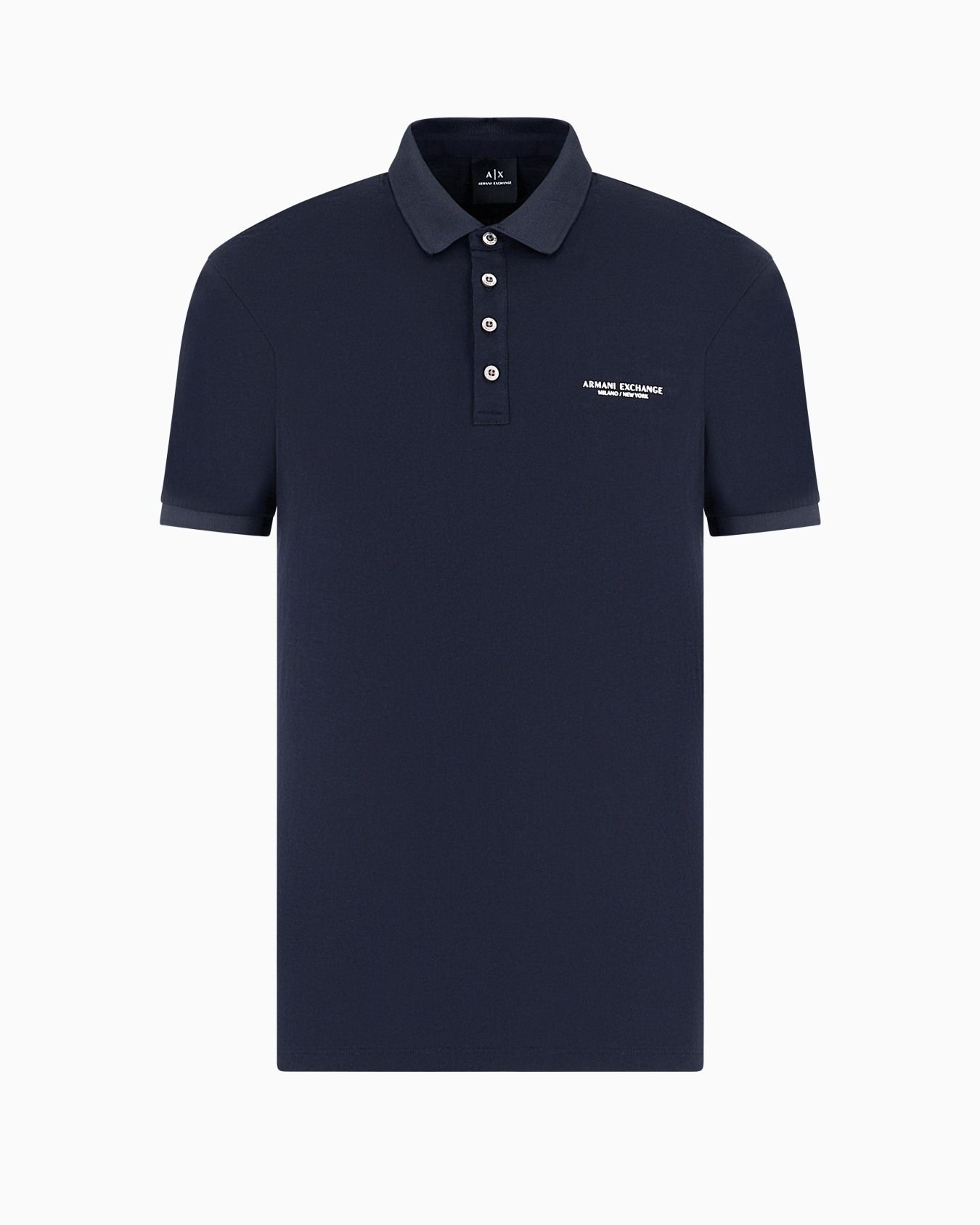 Πόλο μπλουζάκι από βαμβακερό ζέρσεϊ με τις κλασικές λεπτομέρειες του μοντέλου: κανονική εφαρμογή, κοντό μανίκι και γιακάς με κουμπιά. Το λογότυπο «Armani Exchange Milano/New York» γιορτάζει τις δύο πόλεις με τις οποίες η μάρκα είναι πολύ δεμένη.