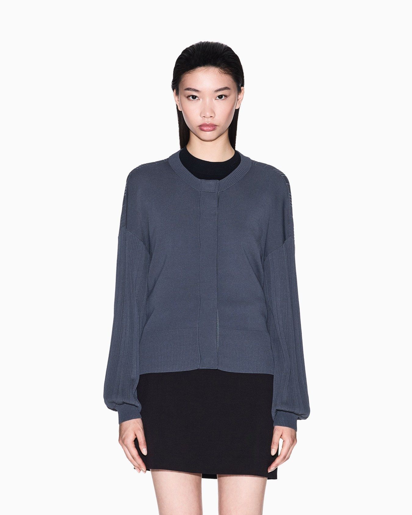 Ζακέτα από απαλό και άνετο νήμα, ένα ένδυμα που επαναπροσδιορίζει την έννοια του πλεκτού με μια πινελιά σύγχρονου σχεδιασμού. Οι απόλυτοι πρωταγωνιστές είναι τα μανίκια, που χαρακτηρίζονται από μια εκλεπτυσμένη ριμπ πτυχή που δημιουργεί έναν κομψό και μοντέρνο όγκο, δίνοντας μια μοναδική αίσθηση στο ένδυμα. Η καθαρή σιλουέτα του σώματος και το μπροστινό κλείσιμο με κουμπιά το καθιστούν απίστευτα ευέλικτο.