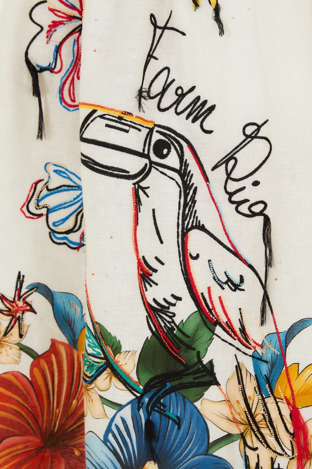 Αγκαλιάστε την κομψότητα με τη φούστα Off-White Tropi Embroidered Euroflax™ Premium Linen Maxi από την FARM Rio. Κατασκευασμένη από αναπνεύσιμο, πολυτελές λινό, αυτή η φούστα διαθέτει ζωηρά τροπικά κεντήματα που χορεύουν κατά μήκος της ρέουσας σιλουέτας της. Η απαλή υπόλευκη βάση έρχεται σε όμορφη αντίθεση με τα πλούσια, πολύχρωμα σχέδια, ενώ το κολακευτικό κόψιμο ταλαντεύεται απαλά με κάθε βήμα, προσκαλώντας ζεστασιά και παιχνιδιάρικη κίνηση στην γκαρνταρόμπα σας. Ένας πραγματικός εορτασμός του βραζιλιάνικου πνεύματος και της δεξιοτεχνίας.