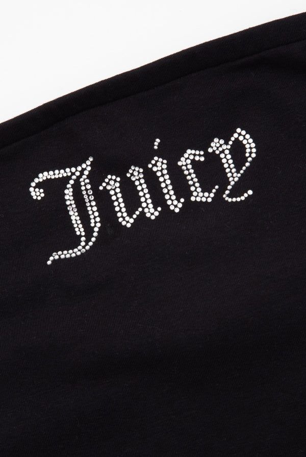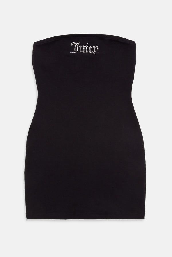 Εφαρμοστό μίνι φόρεμα bandeau σε μαύρο ζέρσεϊ. Αυτό το ελαστικό φόρεμα bodycon διαθέτει διαμάντι λογότυπο «Juicy» στο στήθος.