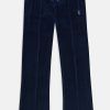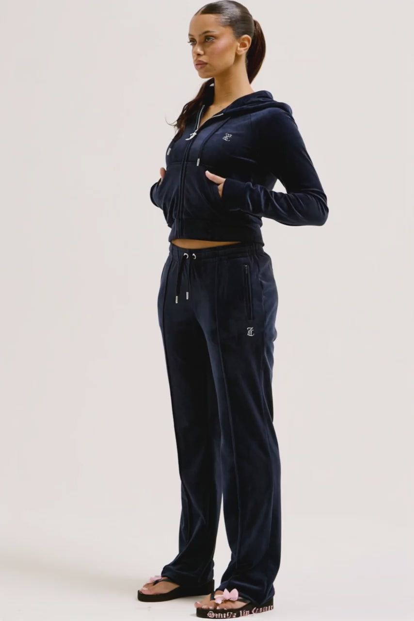Φόρμα σε ίσια γραμμή με διακοσμητικά διαμαντέ, από κλασικό μπλε βελούδο. Μεσαίου ύψους, με ρυθμιζόμενο κορδόνι στη μέση . Διαθέτει τσέπες με φερμουάρ, εντυπωσιακό λογότυπο διαμαντέ στο πίσω μέρος και ασημένια μεταλλικά στοιχεία.