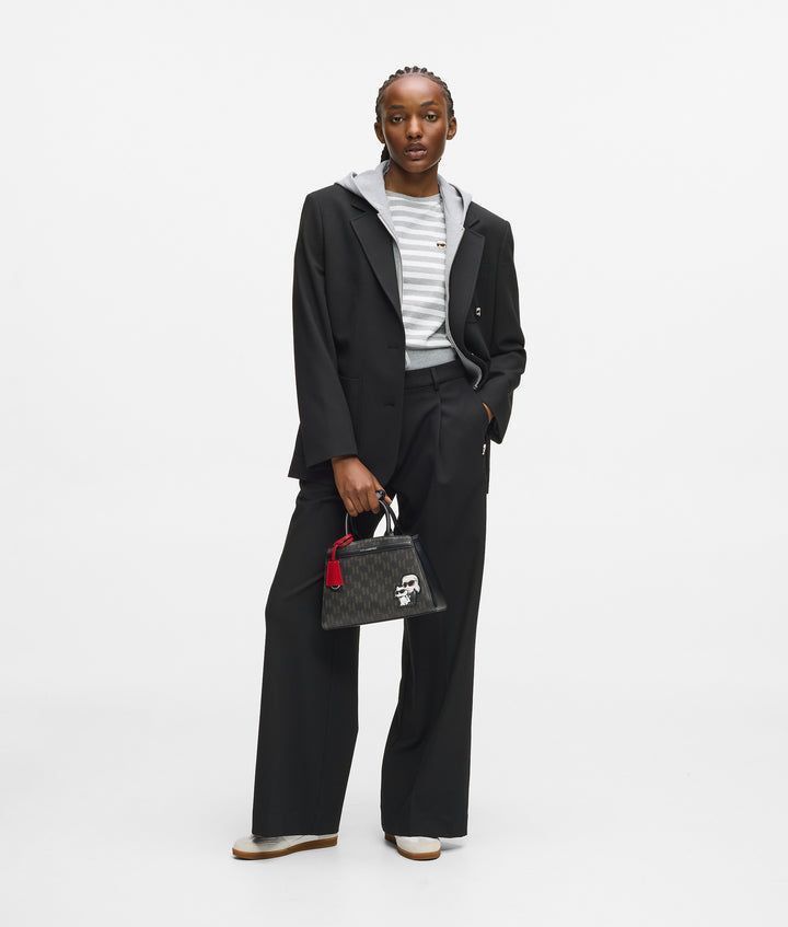 Ένα πολυτελές σχέδιο KL Monogram σε όλη την επιφάνεια είναι διακοσμημένο με παιχνιδιάρικα έργα τέχνης και μια ετικέτα σε αντίθεση σε αυτή την τολμηρή αλλά κομψή τσάντα tote. Οι χειρολαβές στο πάνω μέρος και το αποσπώμενο λουράκι προσφέρουν ευέλικτο στυλ.