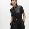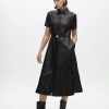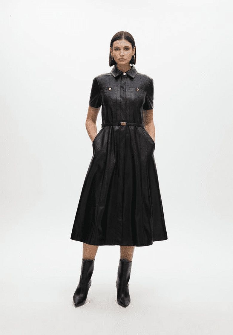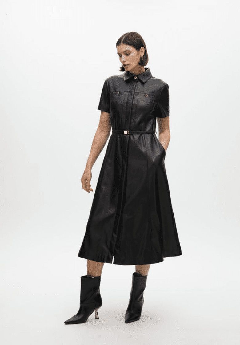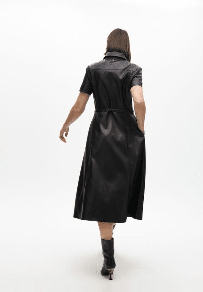 Φόρεμα σε γραμμή Α από συνθετικό δέρμα με ρυθμιζόμενη ζώνη. Κοντά μανίκια και χρυσά κουμπιά στο στήθος. Μίντι μήκος με κλασικό γιακά και κρυφό κλείσιμο μπροστά.