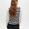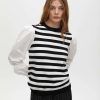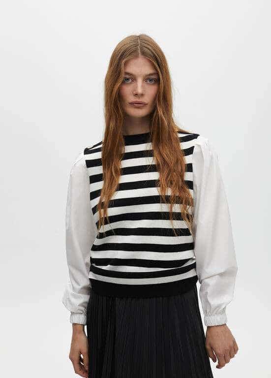 Κομψό πουλόβερ με ριγέ σώμα σε αντίθεση και μανίκια από ποπλίνα. Στρογγυλή λαιμόκοψη και χρυσές λεπτομέρειες με κουμπιά στους ώμους. Κλασική εφαρμογή.