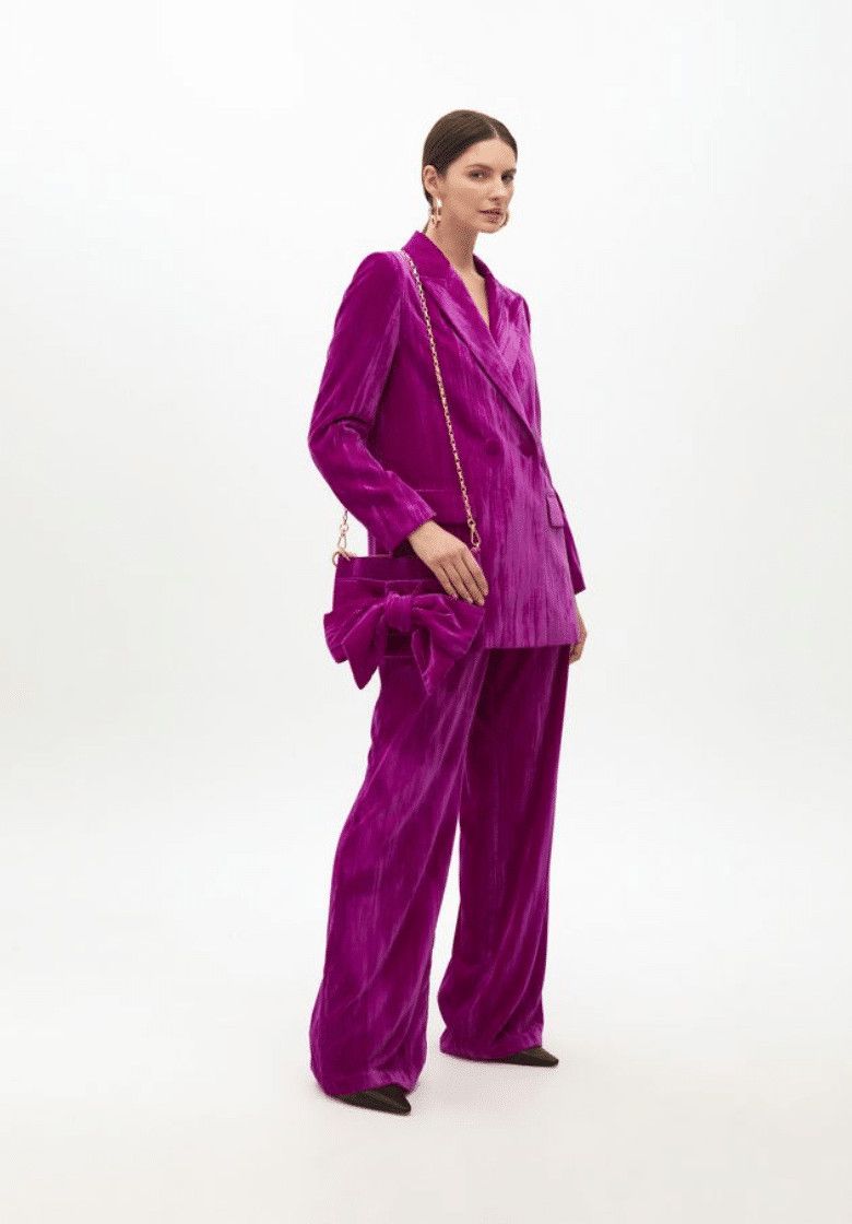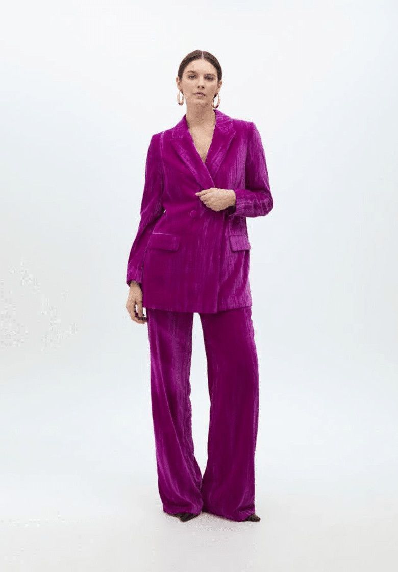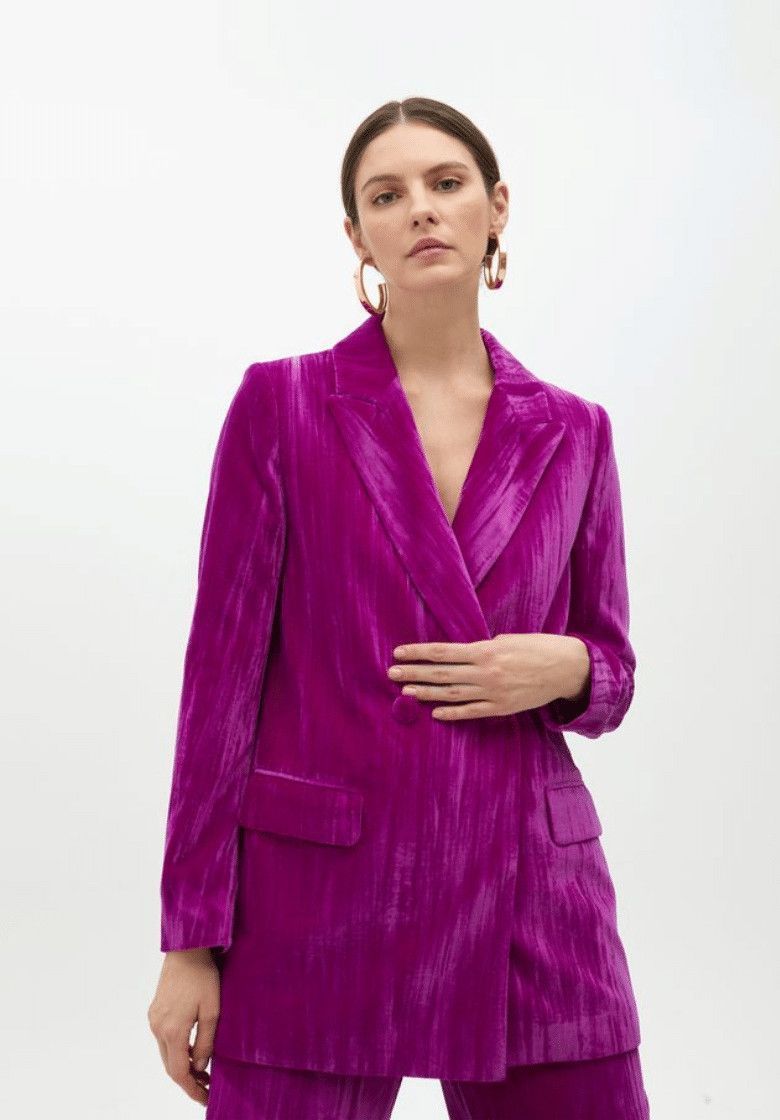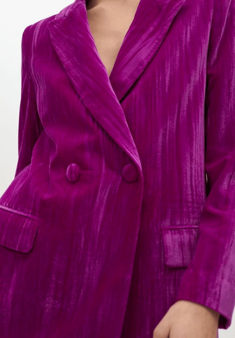 Βελούδινο σακάκι σε έντονο φούξια χρώμα με ένα κομψό λουλούδι στο πέτο. Εφαρμογή με κλείσιμο με κουμπιά και τσέπες με καπάκι. Ένα ξεχωριστό σχέδιο για ειδικές περιστάσεις.