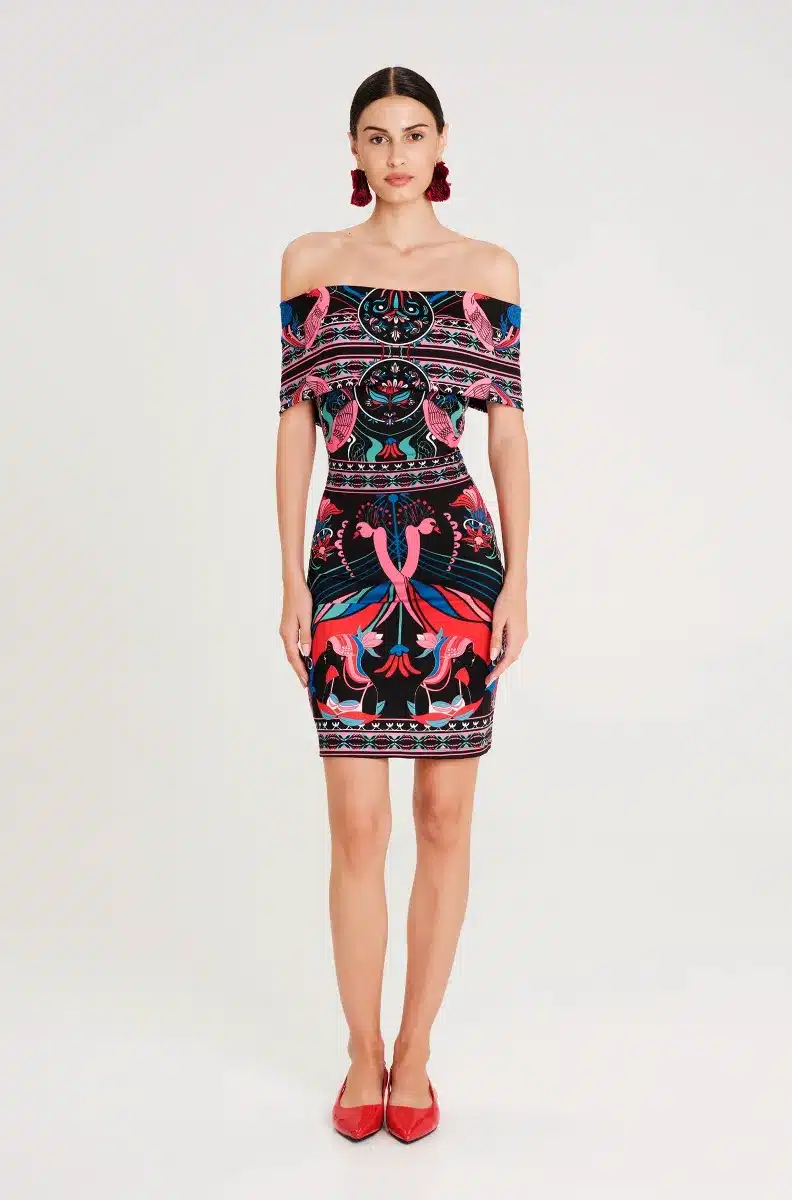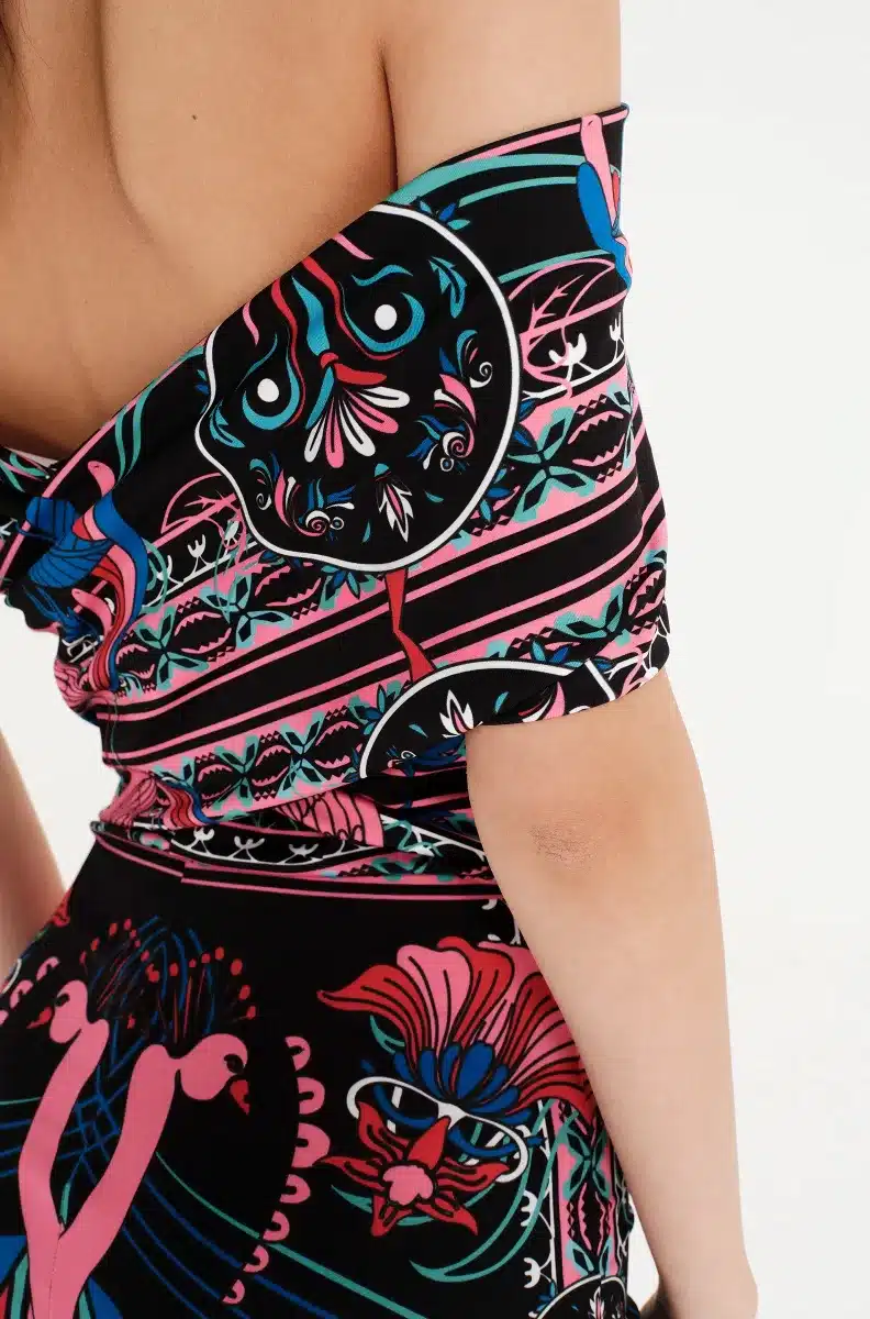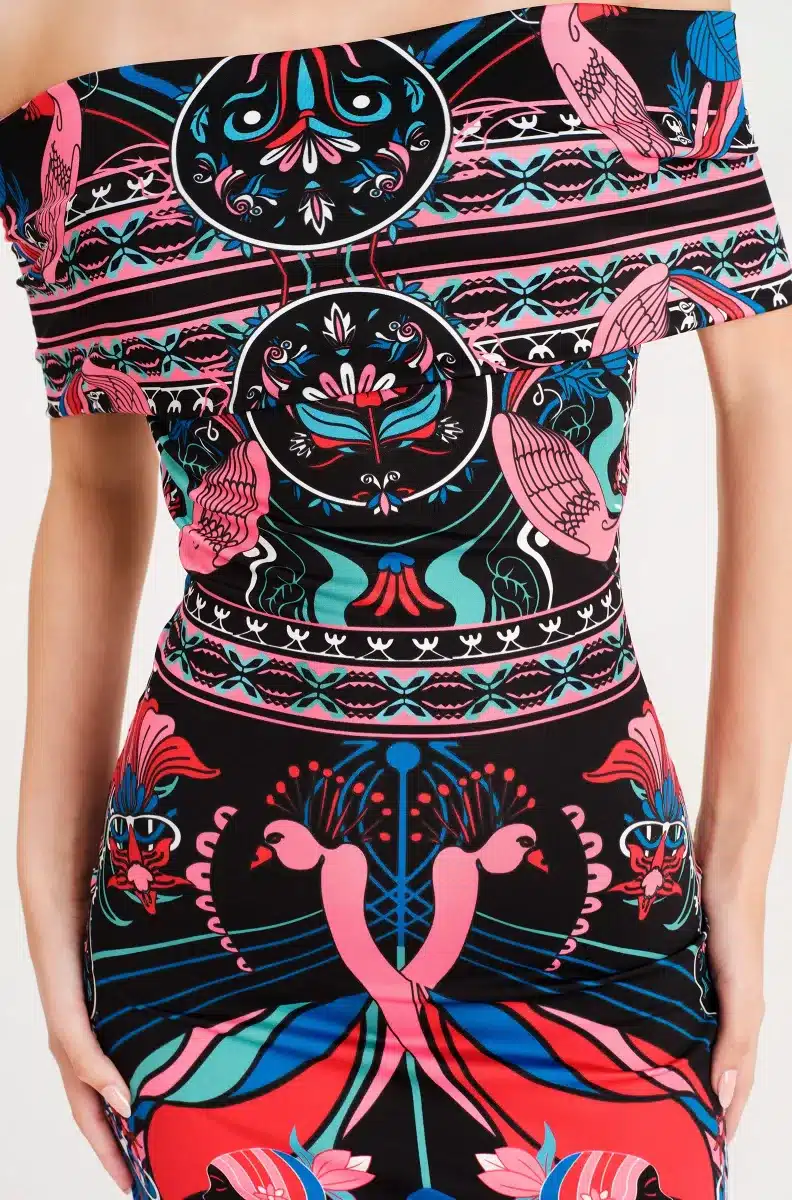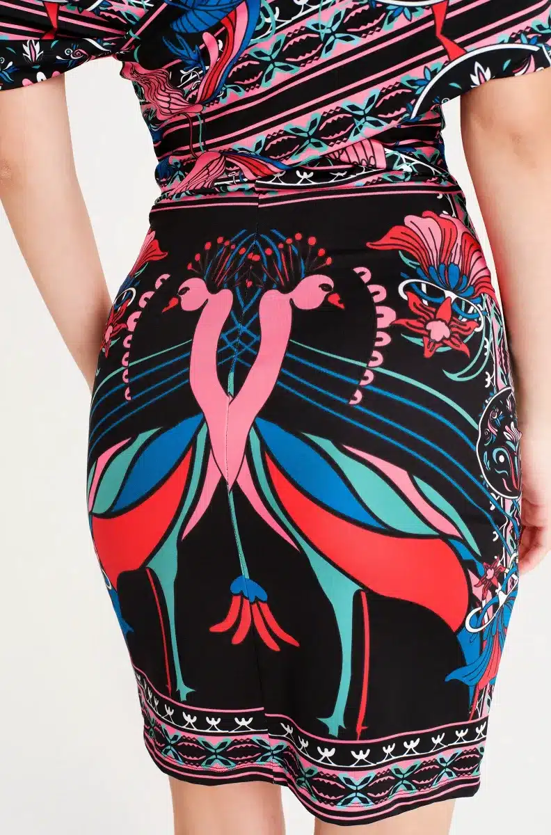 Γιορτάζοντας όλα τα θηλυκά και όμορφα πράγματα, το φόρεμα Cosmology Bodycon Dress μας διαθέτει μοτίβα εμπνευσμένα από την Art Nouveau, πλαισιωμένα από στοιχεία λαϊκής τέχνης. Το στάμπα τοποθέτησης χρησιμοποιεί έντονα χρώματα και λεπτές λεπτομέρειες για να απεικονίσει γυναικείες φιγούρες, φλοράλ και ζευγάρια πουλιά. Αυτό το μίνι φόρεμα με έξω τους ώμους εφαρμόζει κοντά στο σώμα και διαθέτει λεπτομέρεια με εφέ περιτύλιξης στην πλάτη.
