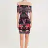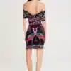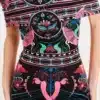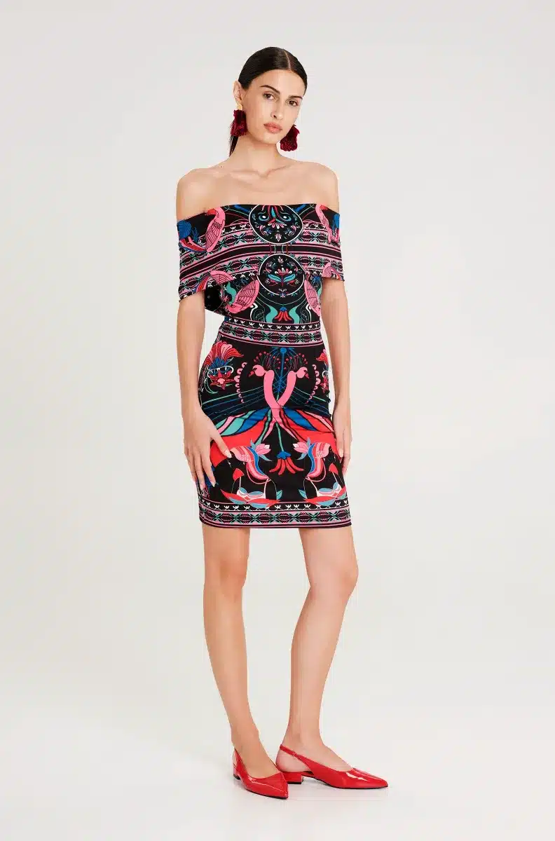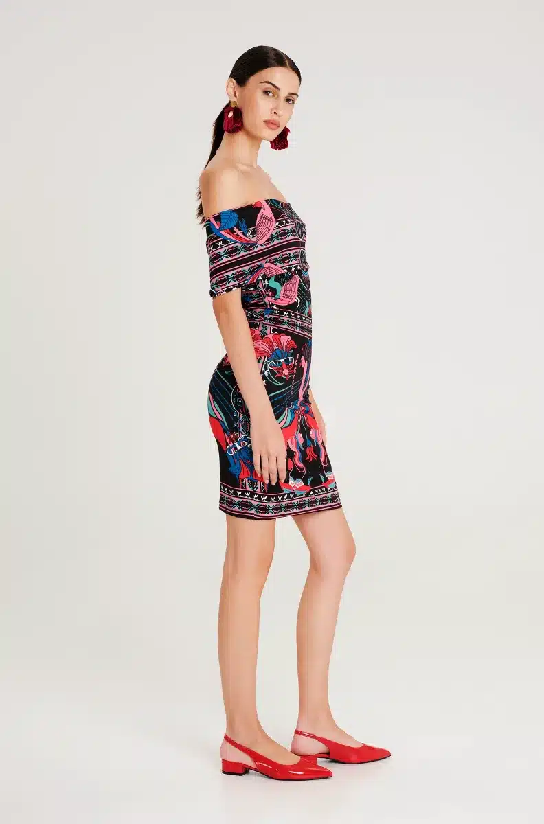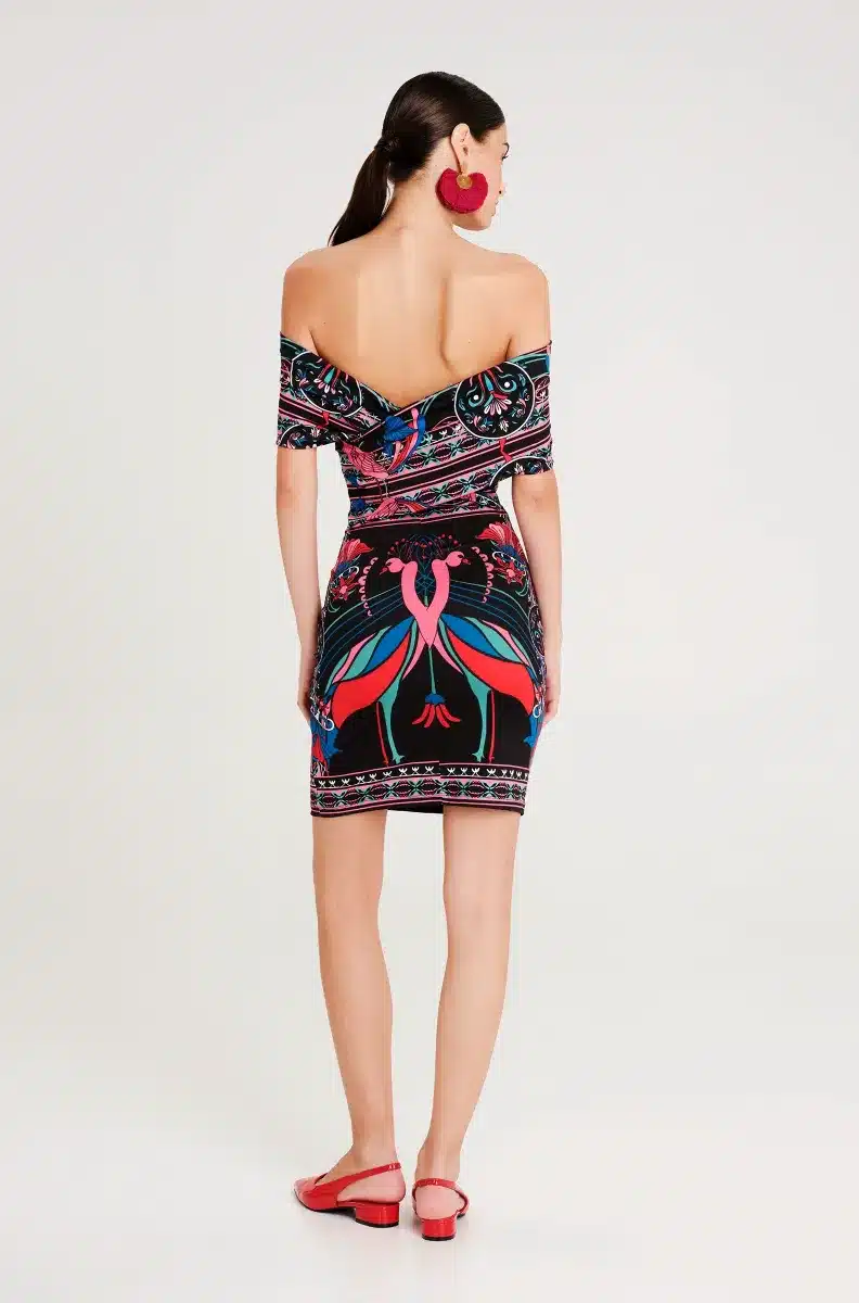 Γιορτάζοντας όλα τα θηλυκά και όμορφα πράγματα, το φόρεμα Cosmology Bodycon Dress μας διαθέτει μοτίβα εμπνευσμένα από την Art Nouveau, πλαισιωμένα από στοιχεία λαϊκής τέχνης. Το στάμπα τοποθέτησης χρησιμοποιεί έντονα χρώματα και λεπτές λεπτομέρειες για να απεικονίσει γυναικείες φιγούρες, φλοράλ και ζευγάρια πουλιά. Αυτό το μίνι φόρεμα με έξω τους ώμους εφαρμόζει κοντά στο σώμα και διαθέτει λεπτομέρεια με εφέ περιτύλιξης στην πλάτη.
