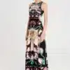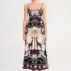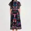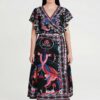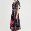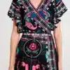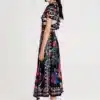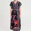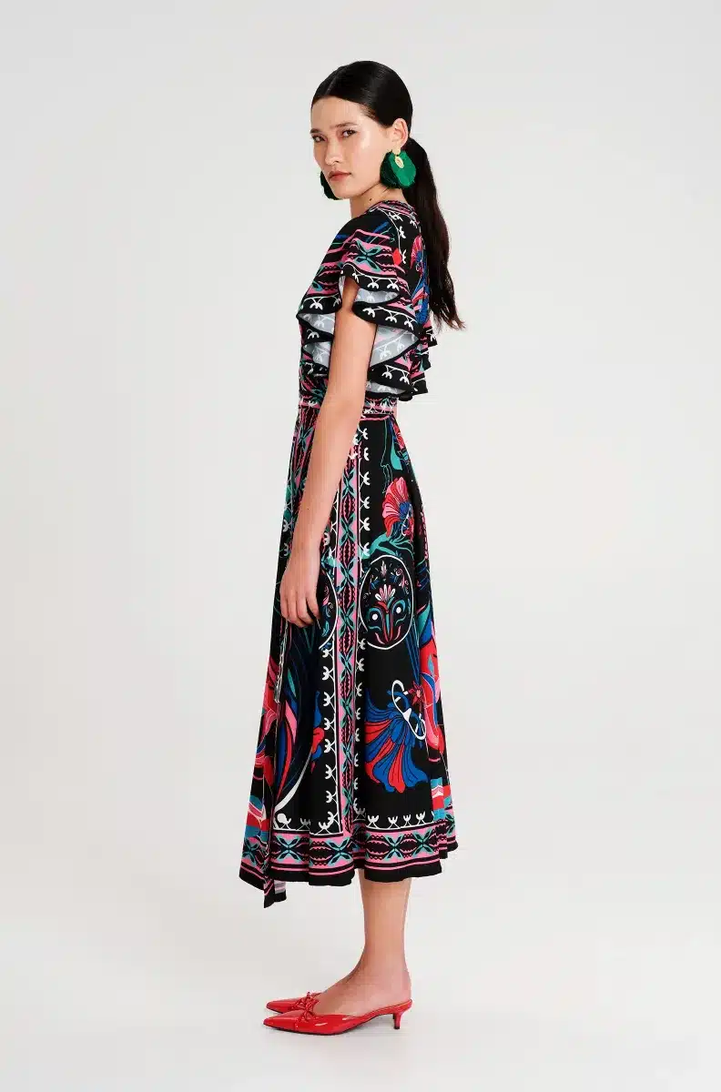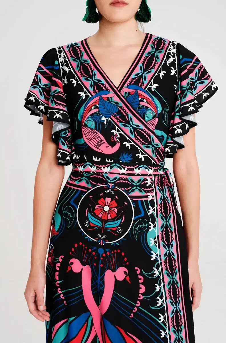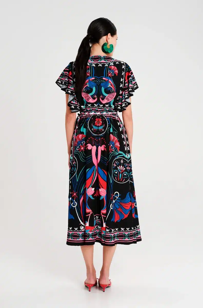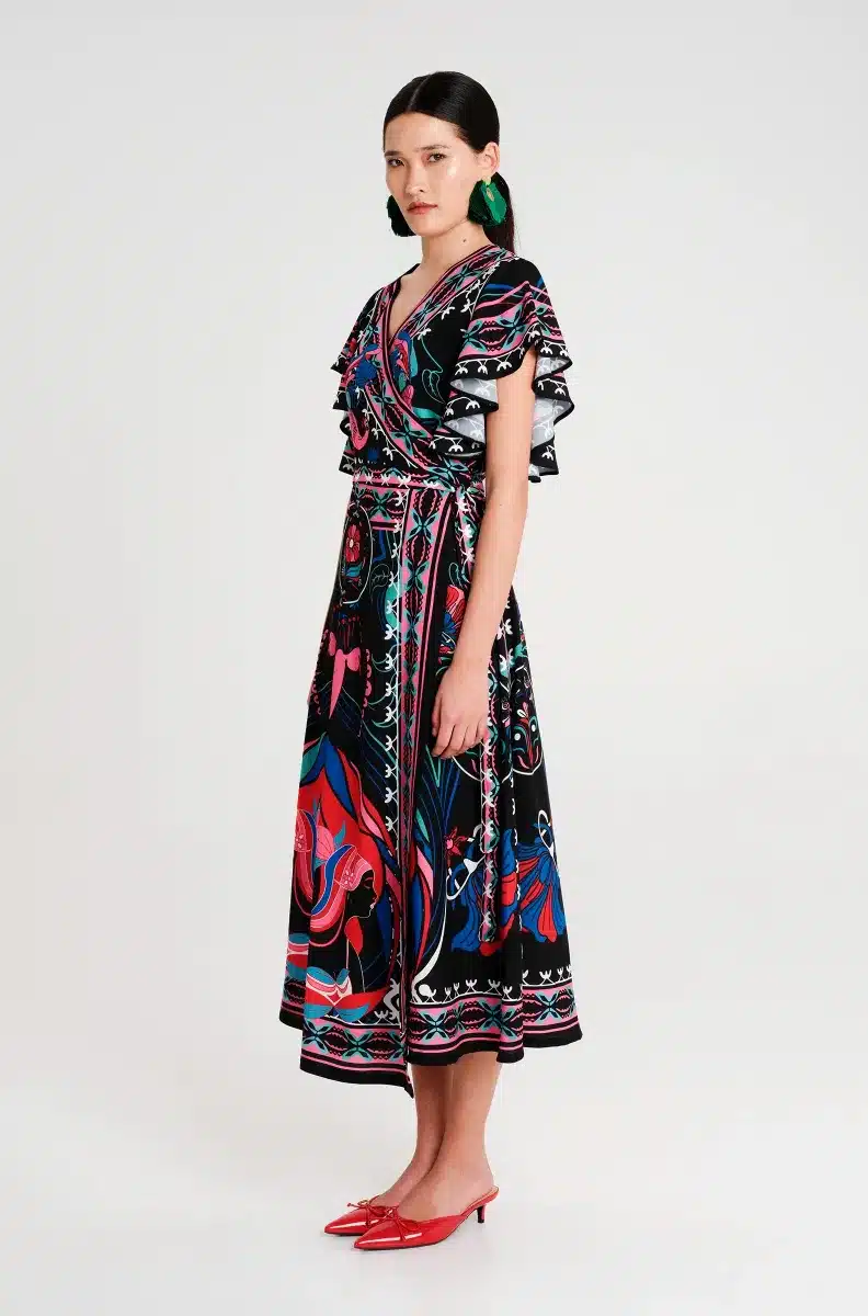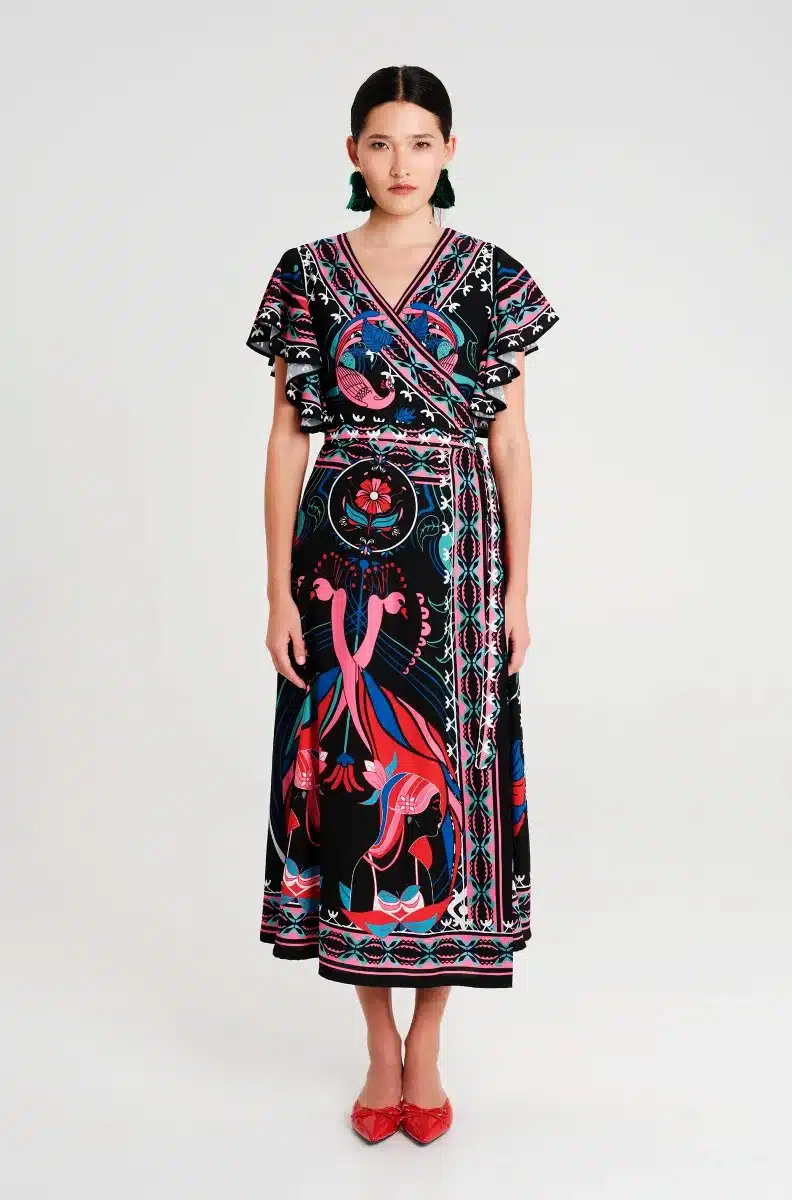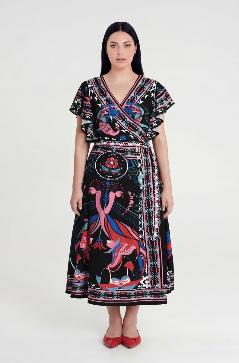 Με το ελεύθερο πνεύμα του boho και την κομψότητα του Art Nouveau, το μακρύ φόρεμα Cosmology Wrap τιμά τις γυναίκες και την ομορφιά. Αυτό το φόρεμα σε γραμμή Α, από μη ελαστικό ύφασμα, έχει ρυθμιζόμενη μέση και θηλυκά κοντά μανίκια με φαρδιά μανίκια που δημιουργούν ένα απαλό εφέ βολάν. Με έντονα χρώματα σε μαύρο, το σχέδιο τοποθέτησης απεικονίζει γυναικείες φιγούρες, ζευγάρια πουλιά, οργανικές γραμμές και μπορντούρες που θυμίζουν παραδοσιακά λαϊκά κεντήματα.