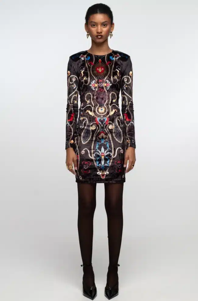 Το Dusk Bodycon Dress ξεχωρίζει με το εντυπωσιακό του print σε έντονες αποχρώσεις και σχέδια εμπνευσμένα από την folk art. Είναι φτιαγμένο από απαλό, ανάγλυφο ύφασμα τύπου ice velvet που χαρίζει πολυτέλεια και λάμψη.