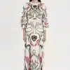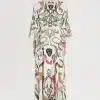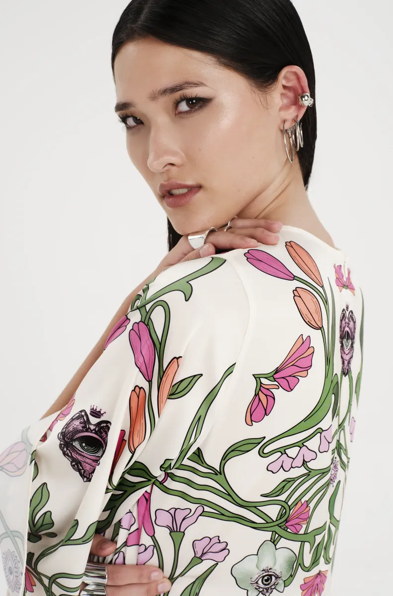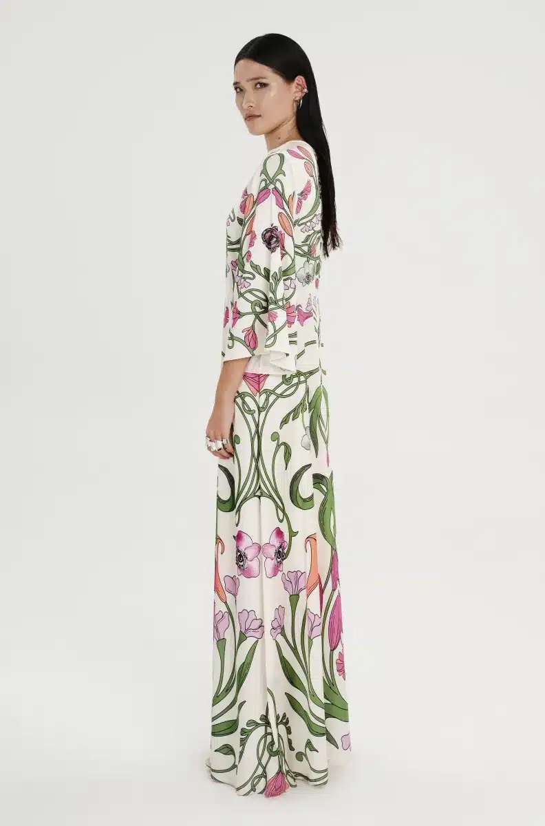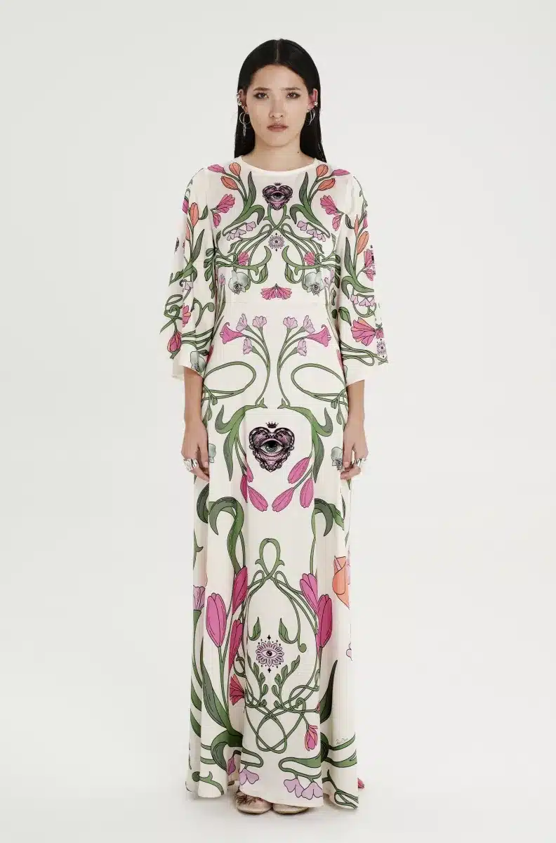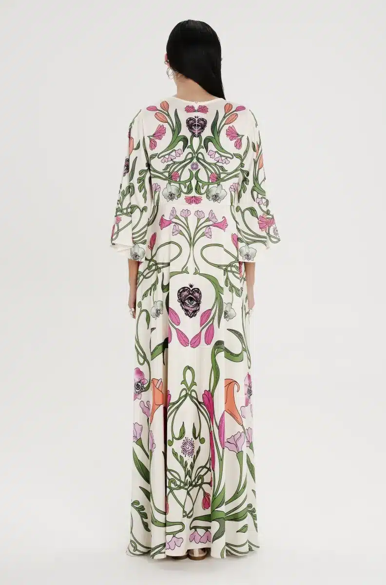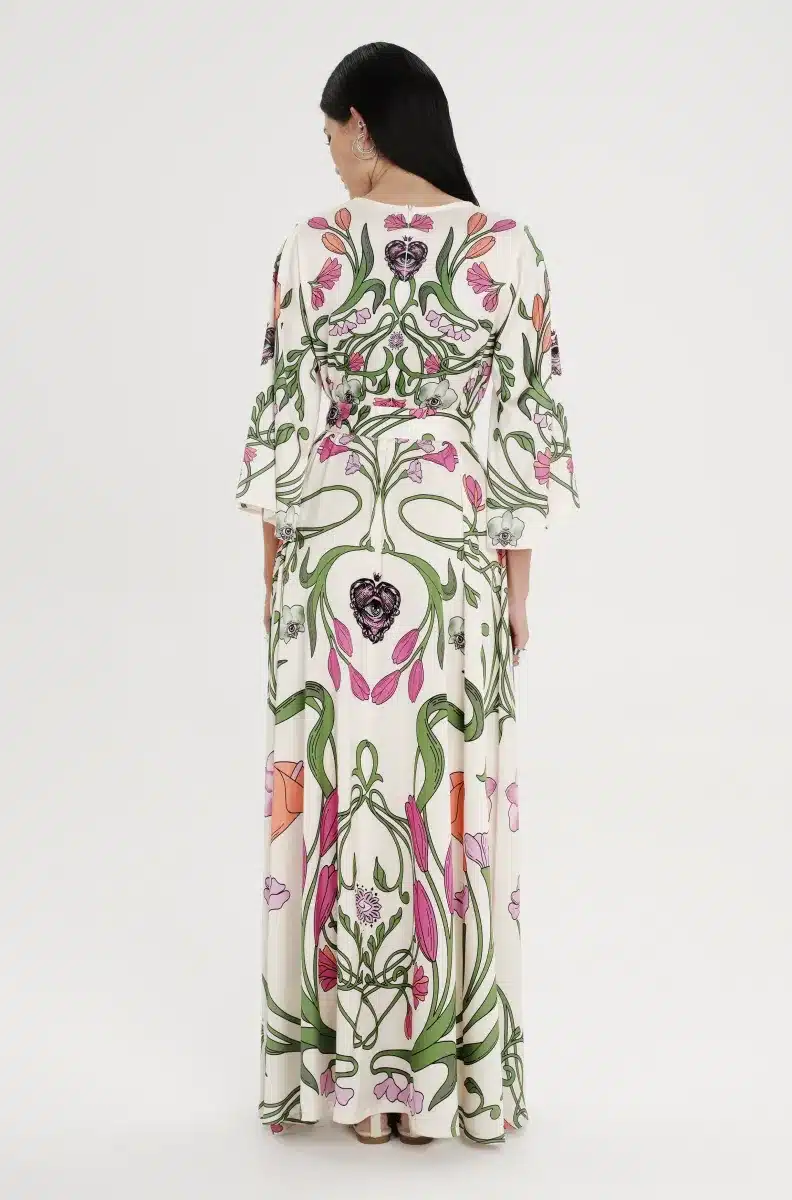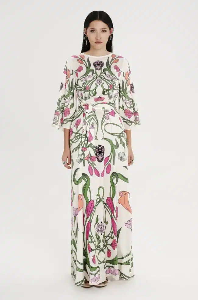 Το Fleur Dress ξεχωρίζει με τα σύμβολα και τα floral σχέδιά του. Έχει placement print σε απαλούς τόνους πάνω σε ecru σατέν jacquard ύφασμα και Α-γραμμή. Τα ¾ καμπάνα μανίκια του προσθέτουν κίνηση, ενώ το κρυφό φερμουάρ και η ζώνη από το ίδιο ύφασμα ολοκληρώνουν το σύνολο. Είναι ένα αέρινο, silky φόρεμα, ιδανικό για events και ιδιαίτερες περιστάσεις.