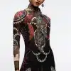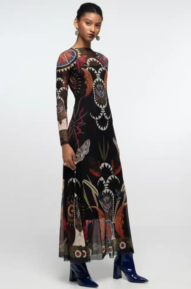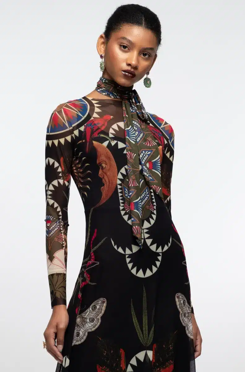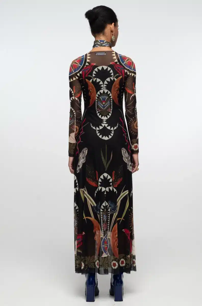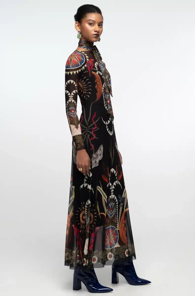 Το Nocturnal Long Dress αναδεικνύει τη μυστηριώδη πλευρά της θηλυκότητας. Με σχέδια από λουλούδια και σύμβολα πάνω σε μαύρο, διάφανο, ελαστικό τούλι, συνδυάζει απαλούς τόνους πολύτιμων λίθων με παλαιωμένο χρυσό. Έχει μακριά μανίκια και Α-γραμμή, ενώ πέφτει όμορφα πάνω από ένα midi opaque μαύρο φόρεμα. Η ζώνη του μπορεί να φορεθεί και σαν φιόγκος στον λαιμό για μια πιο ρομαντική πινελιά.