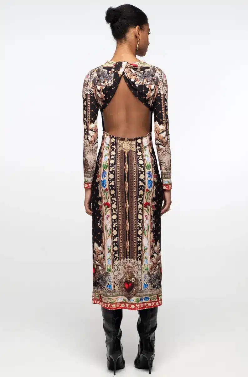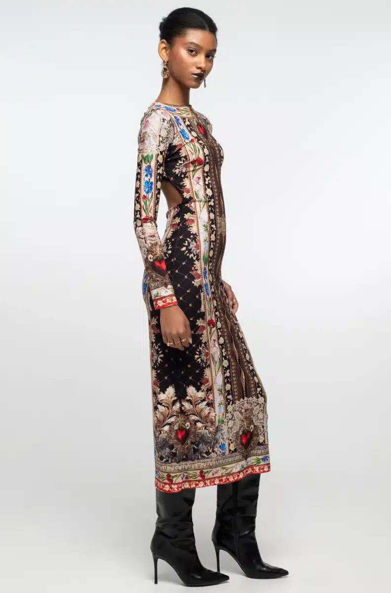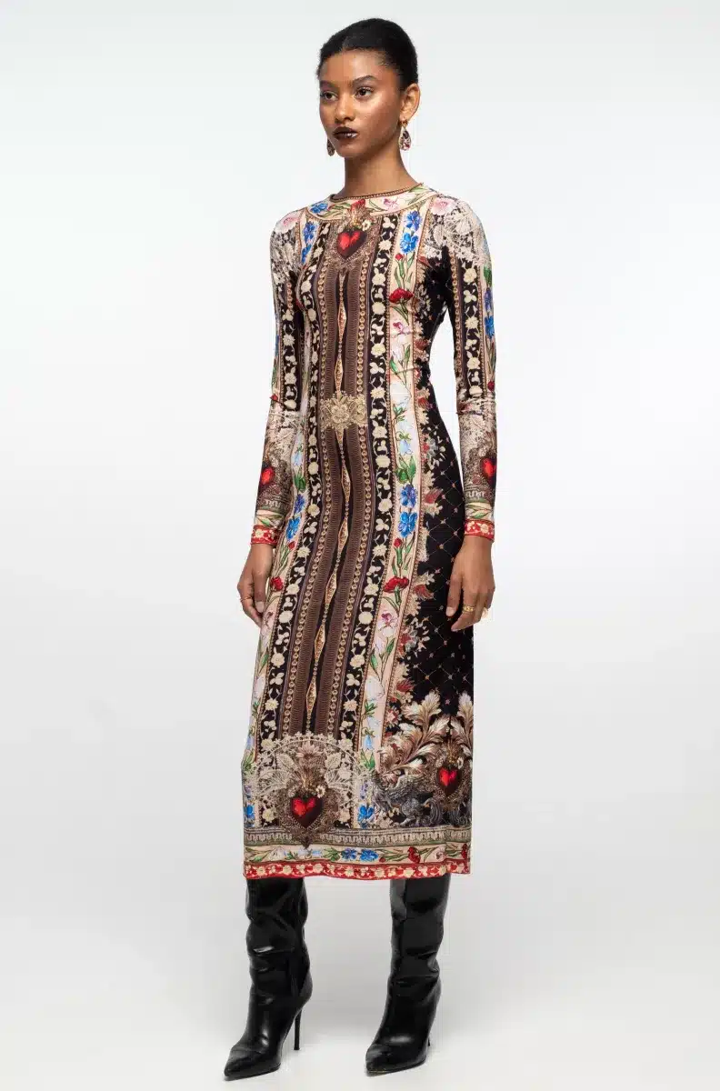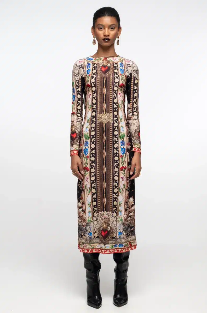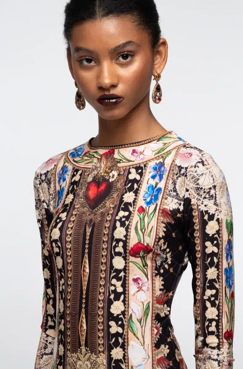 Το Opulence Dress συνδυάζει δαντέλα, πέρλες και floral μοτίβα σε έντονα χρώματα με τον ισχυρό συμβολισμό των burning hearts στο print του. Το μαλακό jersey ύφασμα του αγκαλιάζει τη σιλουέτα, ενώ τα εφαρμοστά μανίκια δίνουν μήκος στα χέρια.