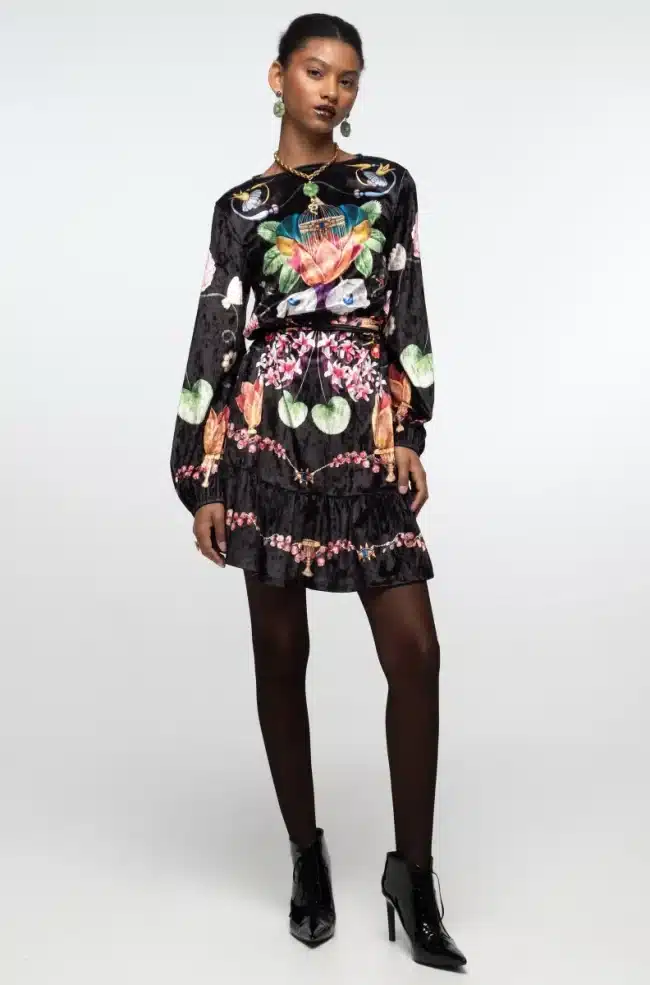 Το φόρεμα Primrose μας δίνει boho ατμόσφαιρα όταν φοριέται χαλαρά και κομψό όταν φοριέται με ζώνη. Αυτό το κοντό φόρεμα σε άνετη γραμμή έχει μακριά μανίκια που τελειώνουν με ελαστικές μανσέτες και φούστα με στρίφωμα με βολάν. Το φερμουάρ στην πλάτη και η στρογγυλή λαιμόκοψη προσθέτουν στην αίσθηση διακριτικότητας, ενώ το συμμετρικό τύπωμα με καθρέφτη σε λαμπερό μαύρο βελούδο του πάγου θυμίζει έναν μαγεμένο κήπο υπό το φως του φεγγαριού.