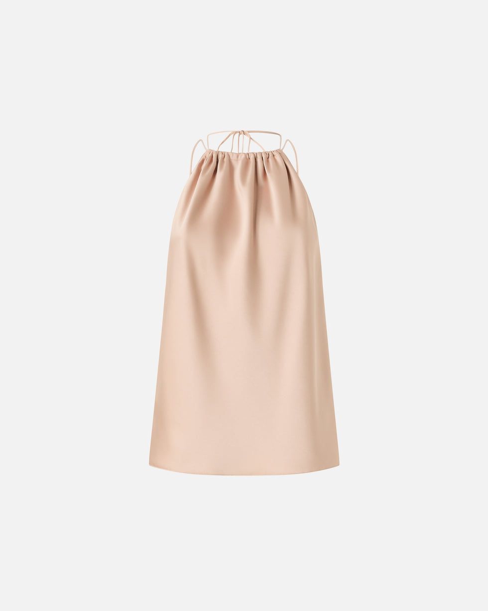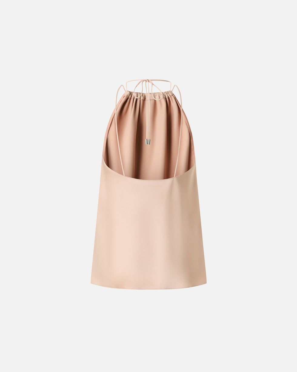 Ένα φαρδύ τοπ με λαιμόκοψη halterneck και ρυθμιζόμενο κορδόνι, που συμπληρώνεται από μεταλλικά τελειώματα που δημιουργούν κομψές σμιλεύσεις στο μπροστινό μέρος και αφήνουν εκτεθειμένο το πάνω μέρος της πλάτης. Κατασκευασμένο από απαλό, λαμπερό σατέν διπλής όψης, δημιουργεί μια εκλεπτυσμένη, άψογη εμφάνιση τόσο εσωτερικά όσο και εξωτερικά. Διαθέτει λεπτές τιράντες ώμου που ταιριάζουν με το κορδόνι, επιτρέποντάς σας να το φοράτε εκτεθειμένο ή κρυφό. Η ρευστότητα αυτού του κομματιού θα σας συναρπάσει σε τελετές και ειδικές περιστάσεις, ειδικά όταν συνδυάζεται με ασορτί παντελόνι.