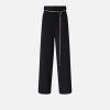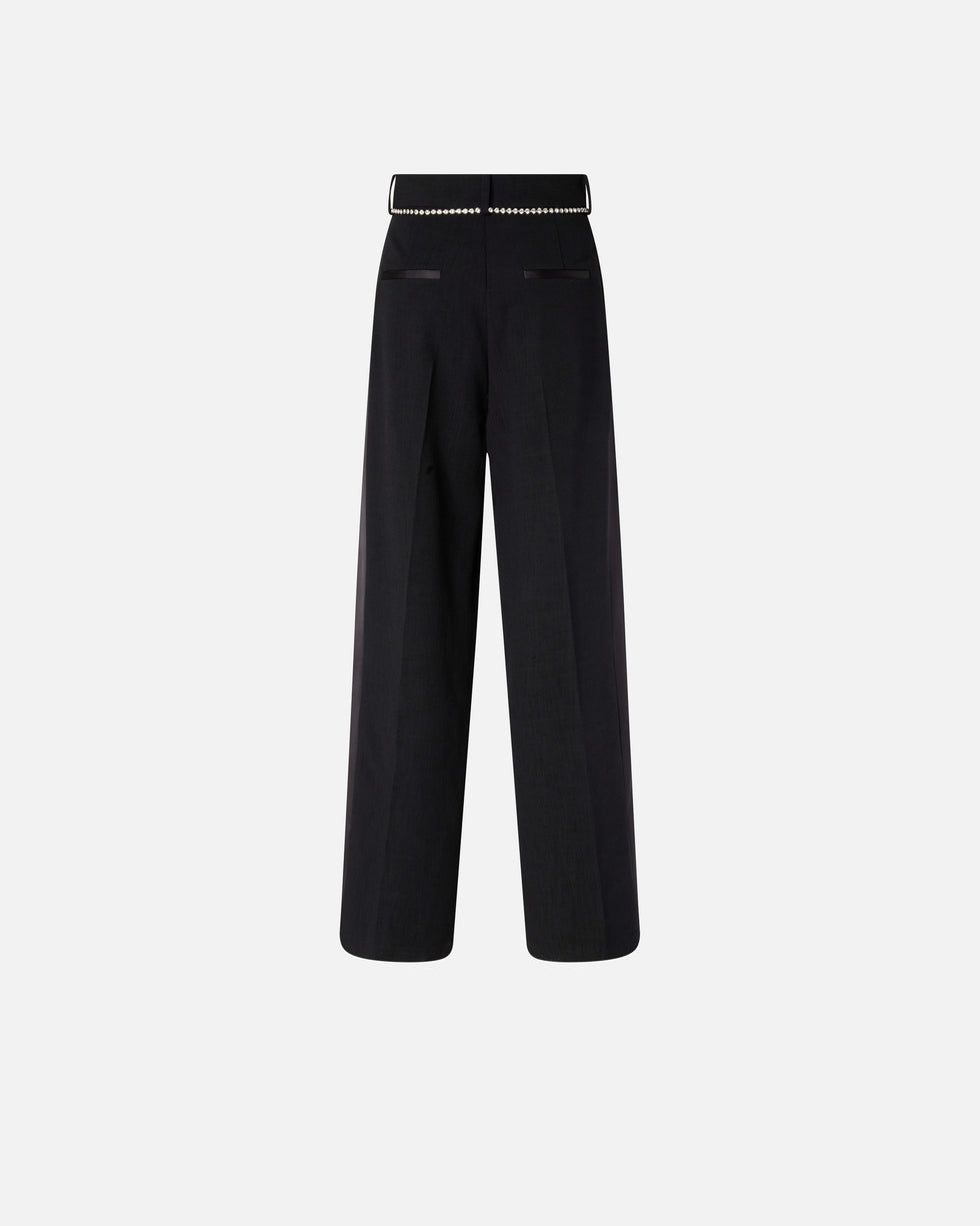 Παντελόνι από ύφασμα με ακανόνιστη υφή από βαμμένο νήμα, που ξεχωρίζει για τις πλευρικές λωρίδες και τις τσέπες με φιλέτο πίσω από γυαλιστερό σατέν του ίδιου χρώματος, που δημιουργεί μια διακριτική αντίθεση με το βασικό ύφασμα. Διαθέτει φόδρα εσωτερικά, ευκολοφόρετο σχέδιο σε ίσια γραμμή, και χαρακτηρίζεται από κομψή σιδερωμένη τσάκιση στο κέντρο κατά μήκος του ποδιού, κρυφές πλευρικές τσέπες και κρυφό κλείσιμο με φερμουάρ και κουμπί. Ωστόσο, η λεπτομέρεια που κάνει τη διαφορά είναι η λεπτή αφαιρούμενη ζώνη, που κλείνει με γαντζάκι, με καστόνια με κρύσταλλα που αντανακλούν το φως με κομψότητα. Συνδυάστε το με το ασορτί σακάκι για ένα σύνολο που θα σας κάνει να λάμπετε ακόμη και στις πιο επίσημες περιστάσεις. – CEDRO TROUSERS