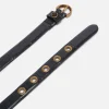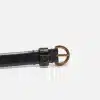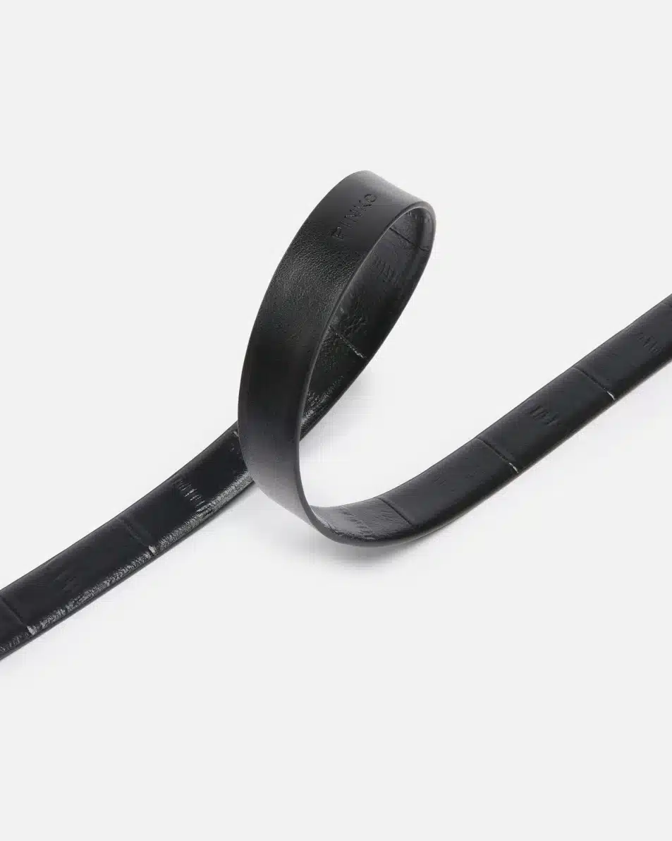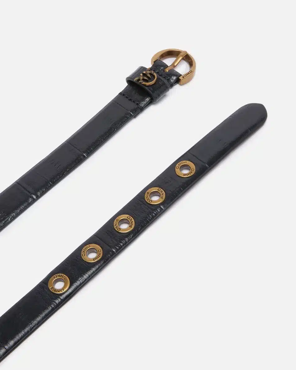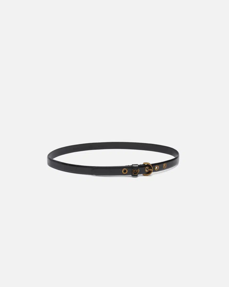 Λεπτή ζώνη, πλάτους 2 cm, από δέρμα με στάμπα χελιού, με αγκράφα σε σχήμα μισοφέγγαρου με κοπή διαμαντιού, θηλάκι με λογότυπο Love Birds και μεταλλικά καψούλια, γαλβανισμένα σε αντικέ χρυσό χρώμα.