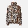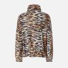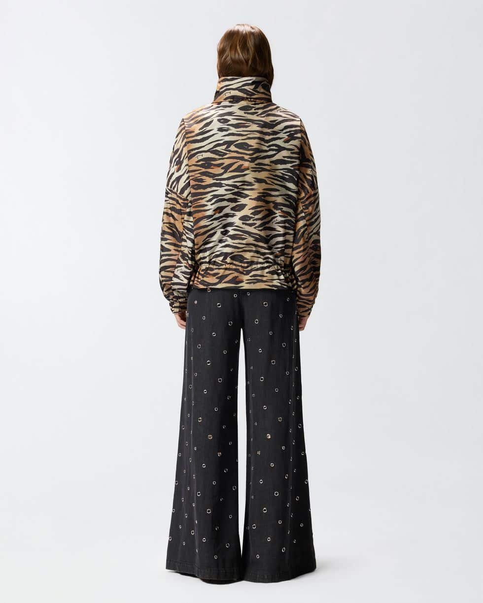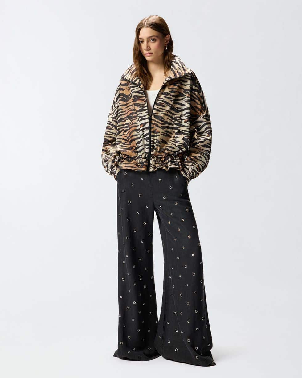 Μπουφάν από φοδραρισμένο τεχνικό ύφασμα με ψηλό γιακά, δύο πλευρικές τσέπες με κουμπί, ελαστικές μανσέτες και εσωτερικό κορδόνι στο κάτω μέρος με στοπάκια. Ο λειτουργικός χαρακτήρας του σχεδιασμού δεν παραλείπει μια προσωπική πινελιά με το αυθεντικό στυλ της PINKO: ένα εντυπωσιακό τιγρέ μοτίβο σε όλη την επιφάνεια, διακοσμημένο με μικρές, διακριτικές υπογραφές με το λογότυπο του brand σε καλλιγραφική γραφή. Το μπουφάν ολοκληρώνεται με ένα πρακτικό κλείσιμο με φερμουάρ μπροστά. – DOTTY BLOUSON