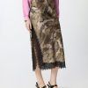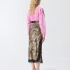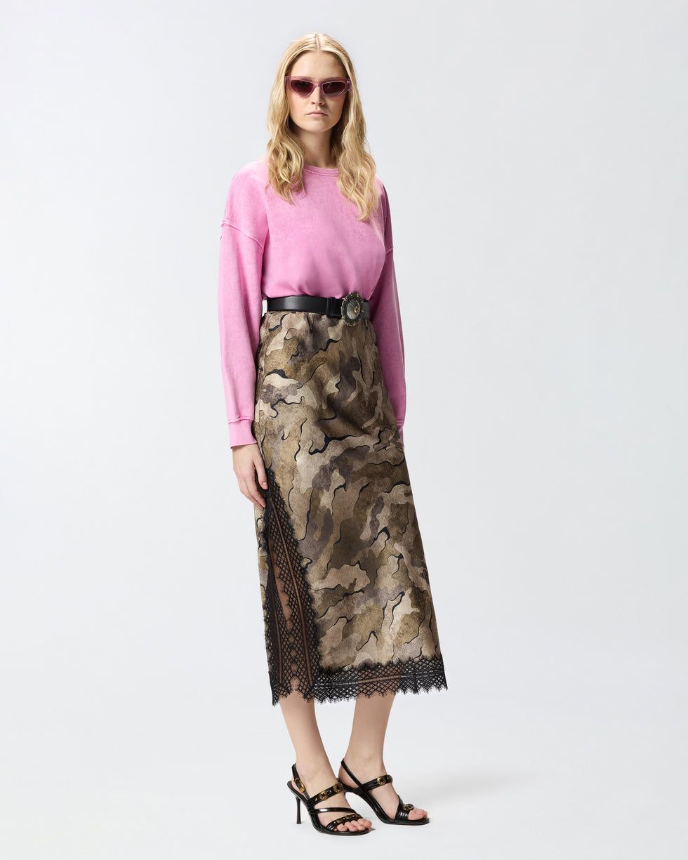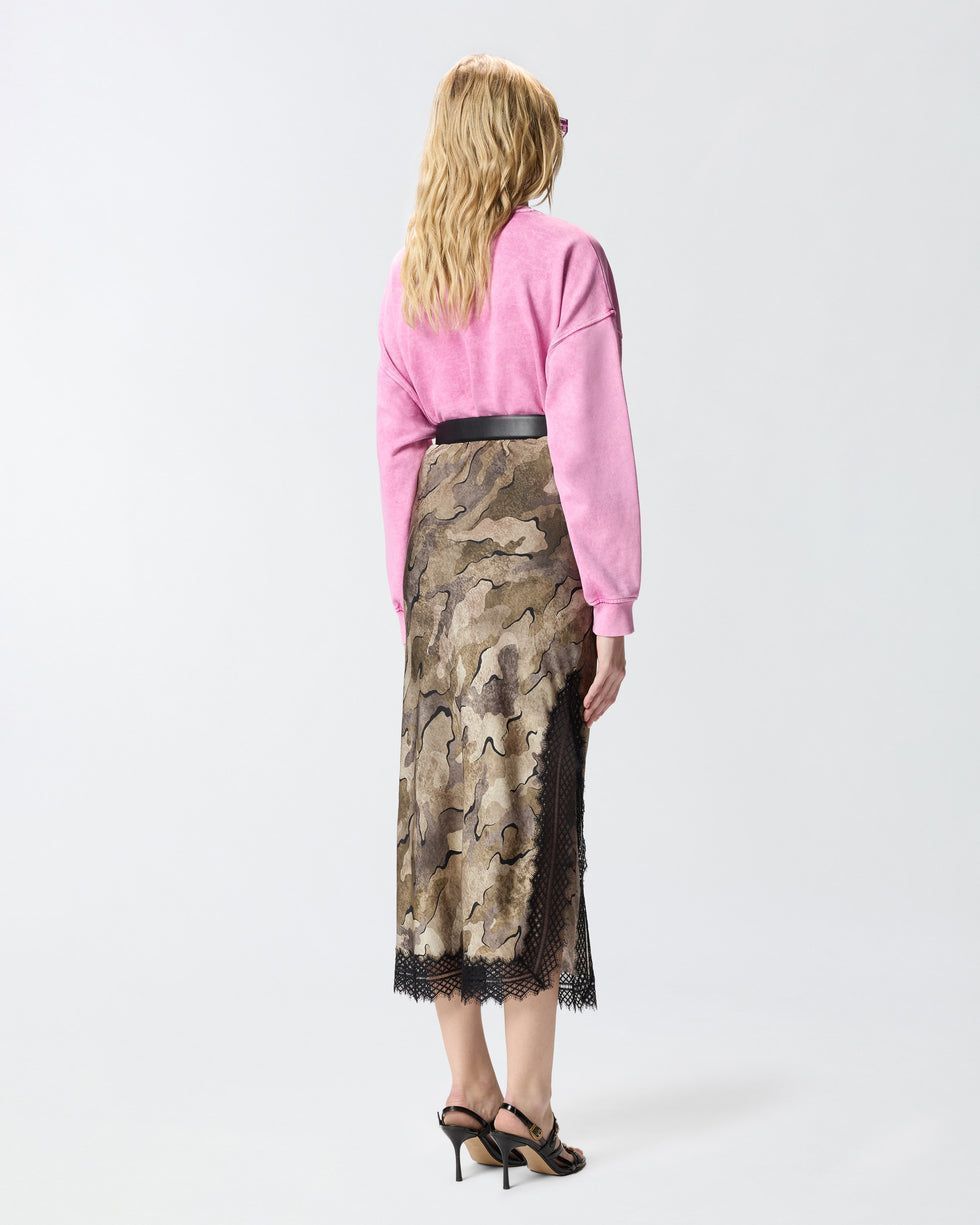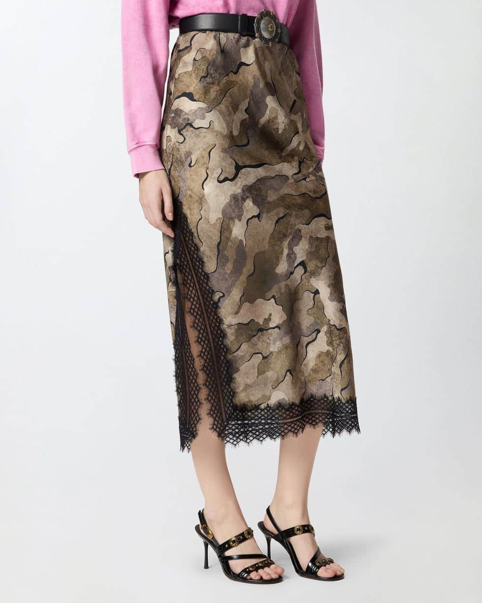 Μίντι φούστα σε ίσια γραμμή με άνετη ελαστική μέση, κατασκευασμένη από λεπτό σατέν ζακάρ ύφασμα με μοτίβο παραλλαγής σε όλη την επιφάνεια για μια military-chic πινελιά. Η φούστα, ιδανική για τολμηρά βραδινά looks, ακόμη και σε συνδυασμό με το ασορτί τοπ, είναι διακοσμημένο με μια λωρίδα από δαντέλα με lingerie στυλ στο κάτω μέρος και κατά μήκος του πλευρικού σκισίματος, με ελαφρώς ξεφτισμένο τελείωμα. – AMBRATO SKIRT