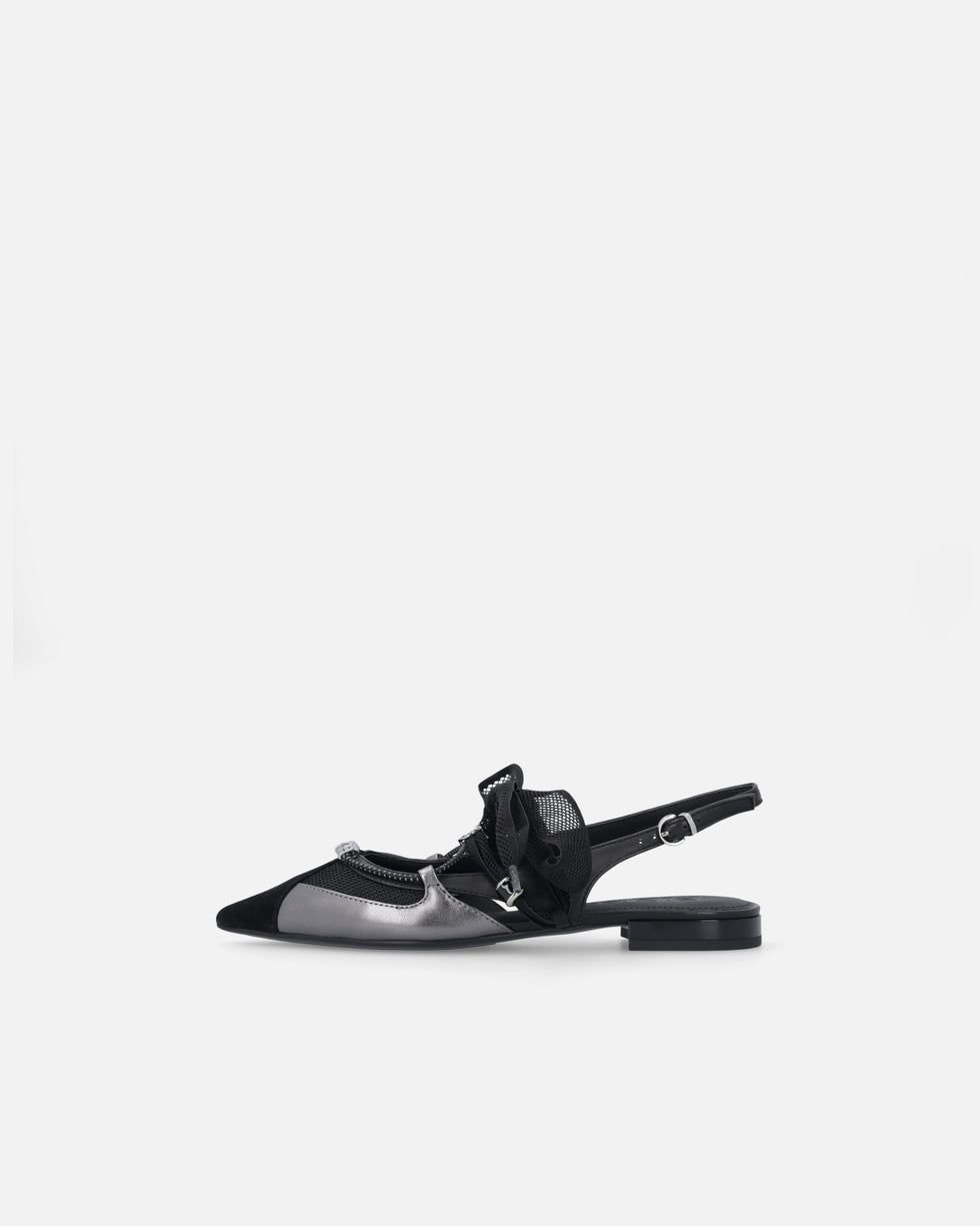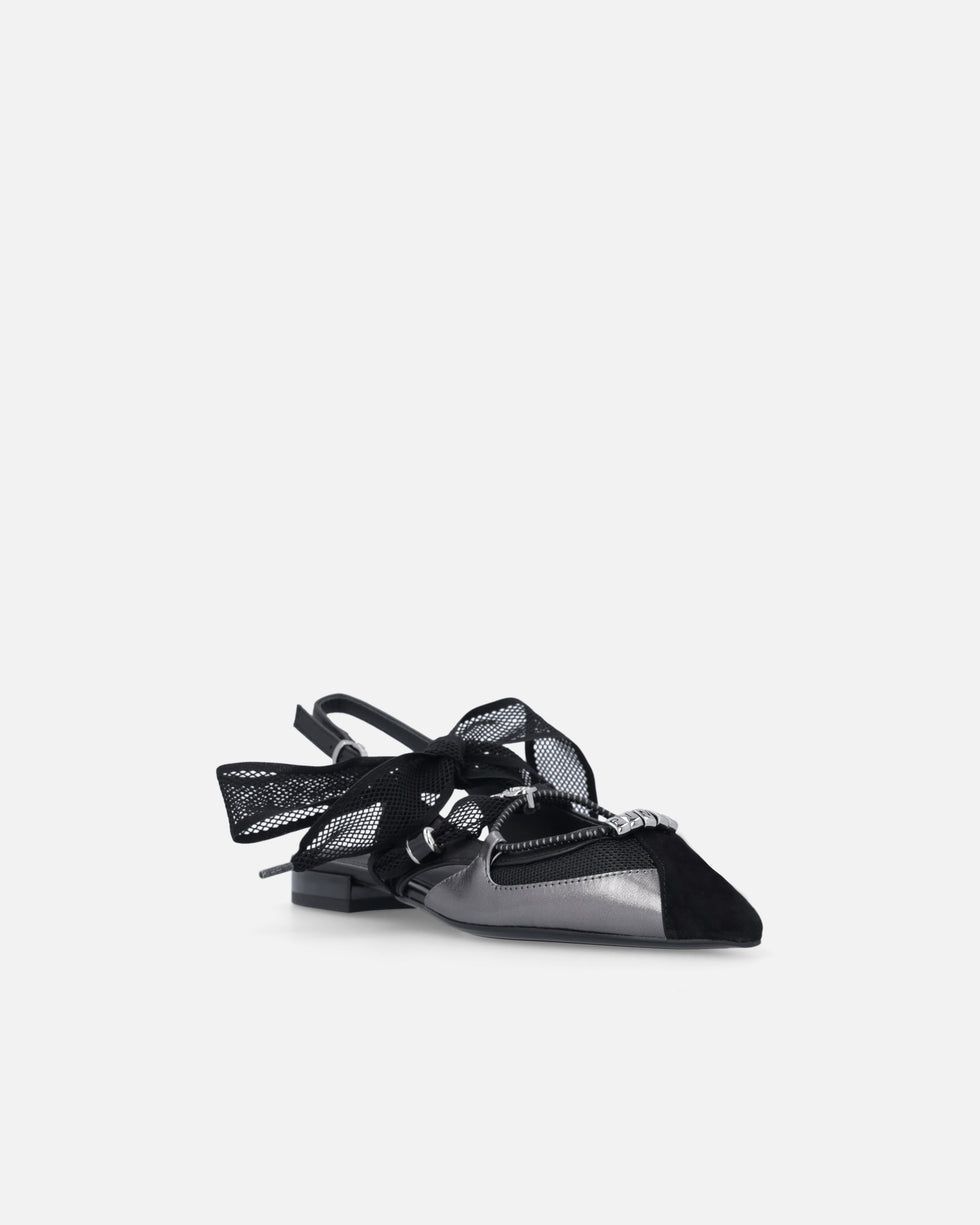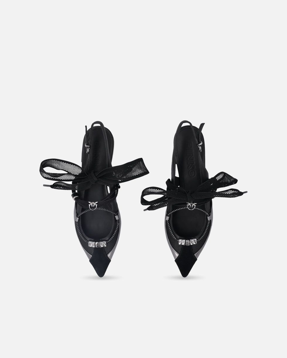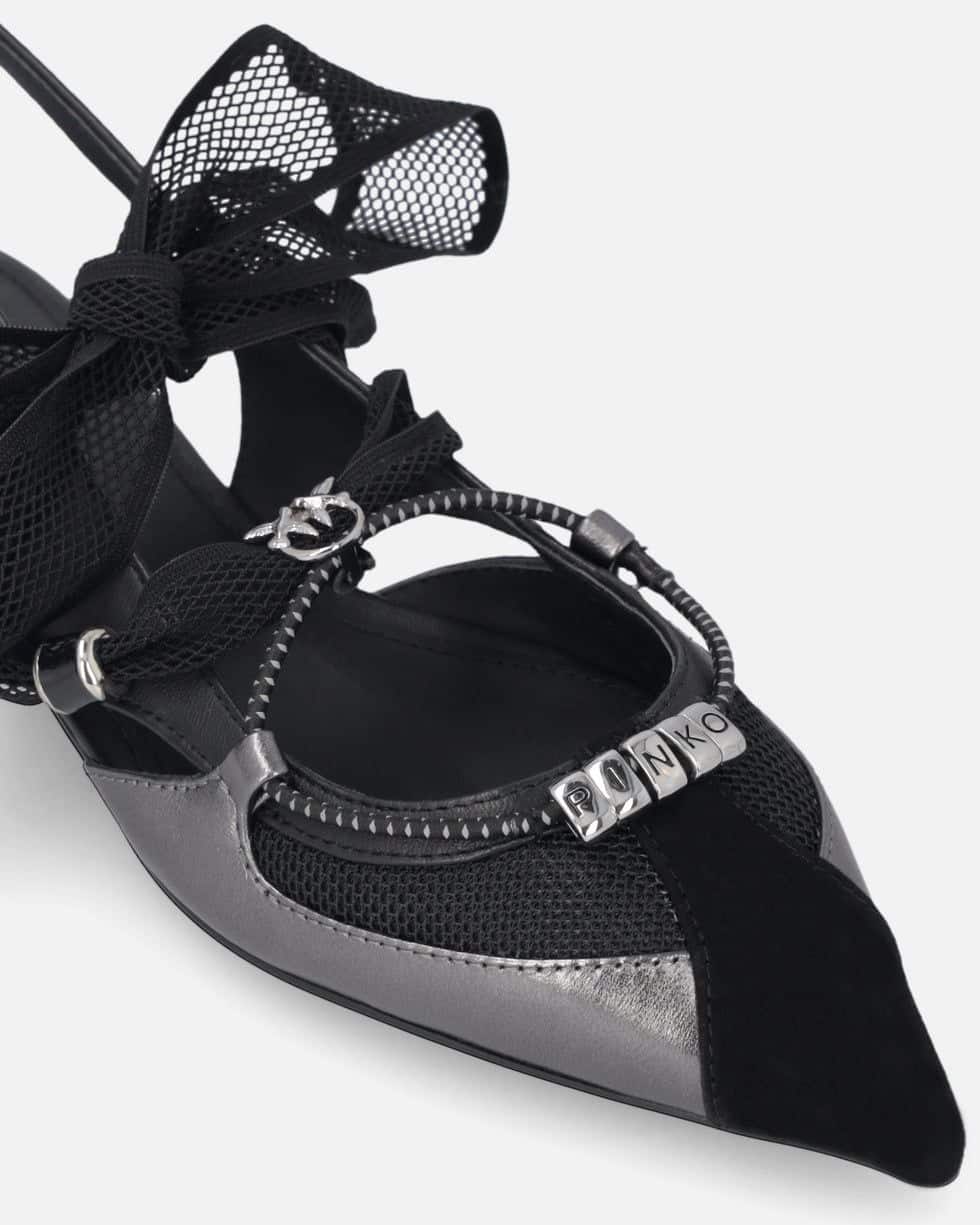 Αυτή την άνοιξη, χαρίστε στην γκαρνταρόμπα σας μια πινελιά εκλεπτυσμένης θηλυκότητας με αυτές τις flat slingback μπαλαρίνες, κατασκευασμένες από μαλακό, λείο δέρμα nappa, με σουέτ μύτη και τμήματα από mesh. Τα κορδόνια που δένονται σε φιόγκο, επίσης από mesh, είναι διακοσμημένα με χάντρες και μεταλλικό λογότυπο Love Birds, ενώ το κάτω κορδόνι, με διακριτικά γραφικά στοιχεία, διαθέτει μεταλλικούς κρίκους με γράμματα που σχηματίζουν το εμβληματικό λογότυπο PINKO. Οι μπαλαρίνες διαθέτουν κομψή, μακρόστενη γραμμή με μυτερή μύτη που προσδίδει φινέτσα, καθώς και επίπεδη σόλα που εξασφαλίζει ελαφρότητα και άνεση για καθημερινή χρήση χωρίς συμβιβασμούς στο στυλ. Ιδανικές τόσο για πρωινές όσο και για βραδινές εμφανίσεις, αυτές οι μπαλαρίνες σίγουρα δεν θα σας αφήσουν να περάσετε απαρατήρητη. – GIANIRA 30