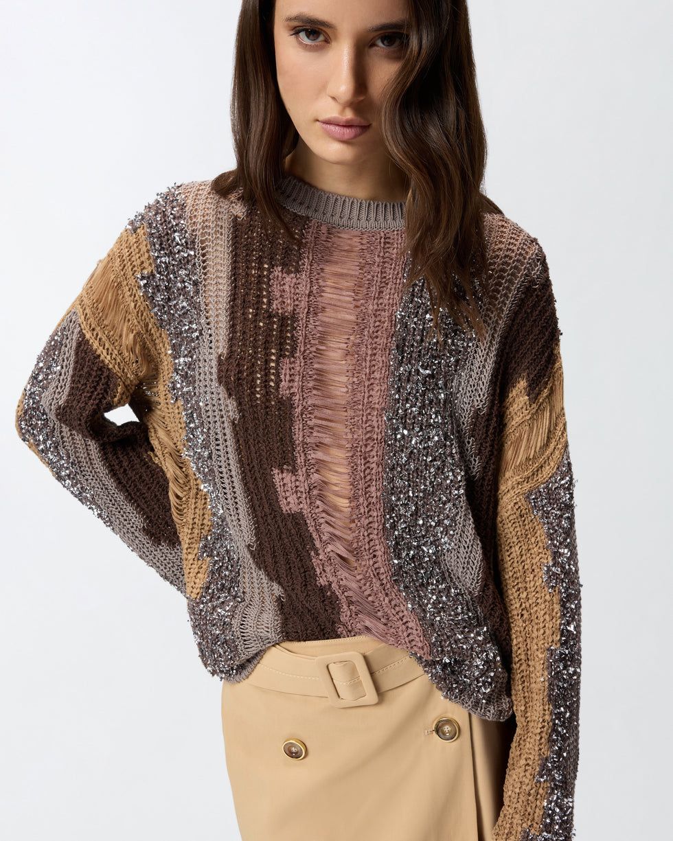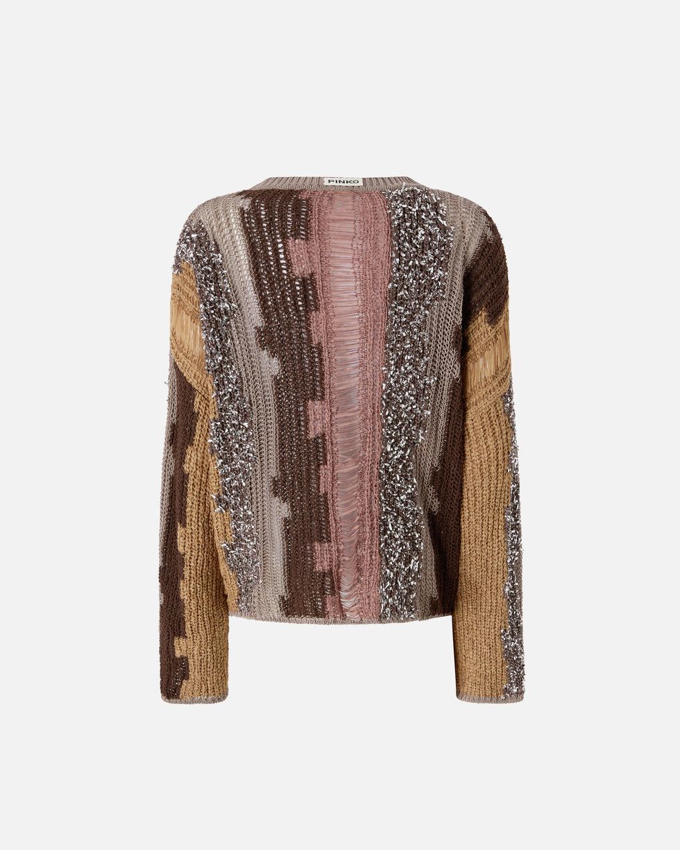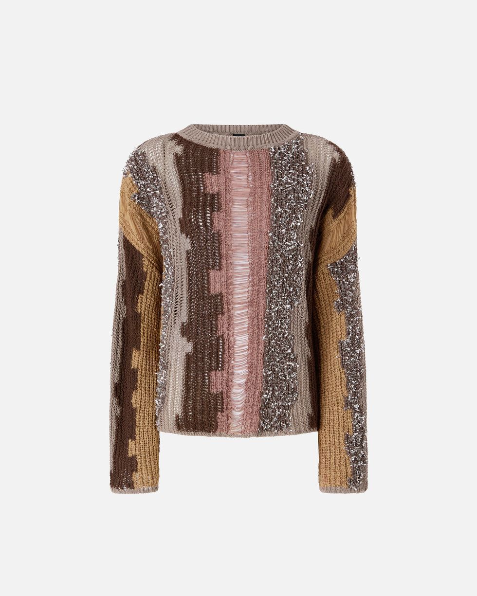 Πουλόβερ από μείγμα βαμβακιού με κάθετο μοτίβο σε όλη την επιφάνεια, αποτελούμενο από εκλεπτυσμένη ένθετη στρώση νημάτων σε διαφορετικά χρώματα και υφές, συμπεριλαμβανομένης μιας μεταλλικής πούλιας που προσθέτει μια πινελιά λάμψης. Το σχέδιο με τη στρογγυλή λαιμόκοψη και οι ελαφρώς χαμηλωμένοι ώμοι συμπληρώνονται από μια ετικέτα με το λογότυπο PINKO στο πίσω μέρος, που ενσαρκώνει το DNA της μάρκας. – ΠΟΥΛΟΒΕΡ LIBECCIO