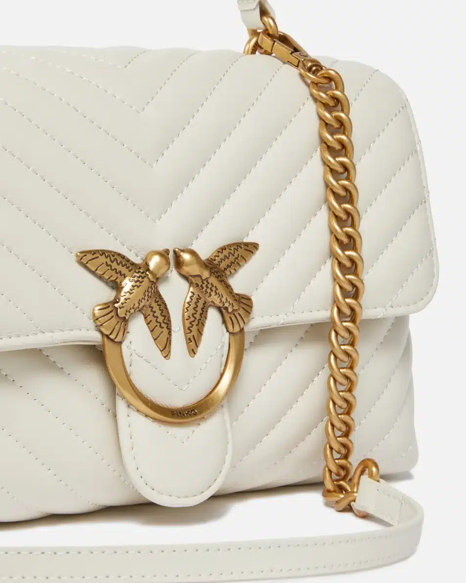 Τσάντα Classic Love Bag Puff από καπιτονέ δέρμα nappa με σεβρόν σχέδιο. Το κλείσιμο ολοκληρώνεται με την εμβληματική μεταλλική αγκράφα Love Birds Diamond Cut. Το εσωτερικό είναι φοδραρισμένο με ύφασμα από μικροΐνες με σουέτ υφή και διαθέτει διαχωριστικό που κλείνει με φερμουάρ και τσέπη στο τοίχωμα. Το λουρί συνδυάζει την κλασική στρογγυλή μεταλλική αλυσίδα με το πρακτικό, ρυθμιζόμενο δερμάτινο λουράκι.