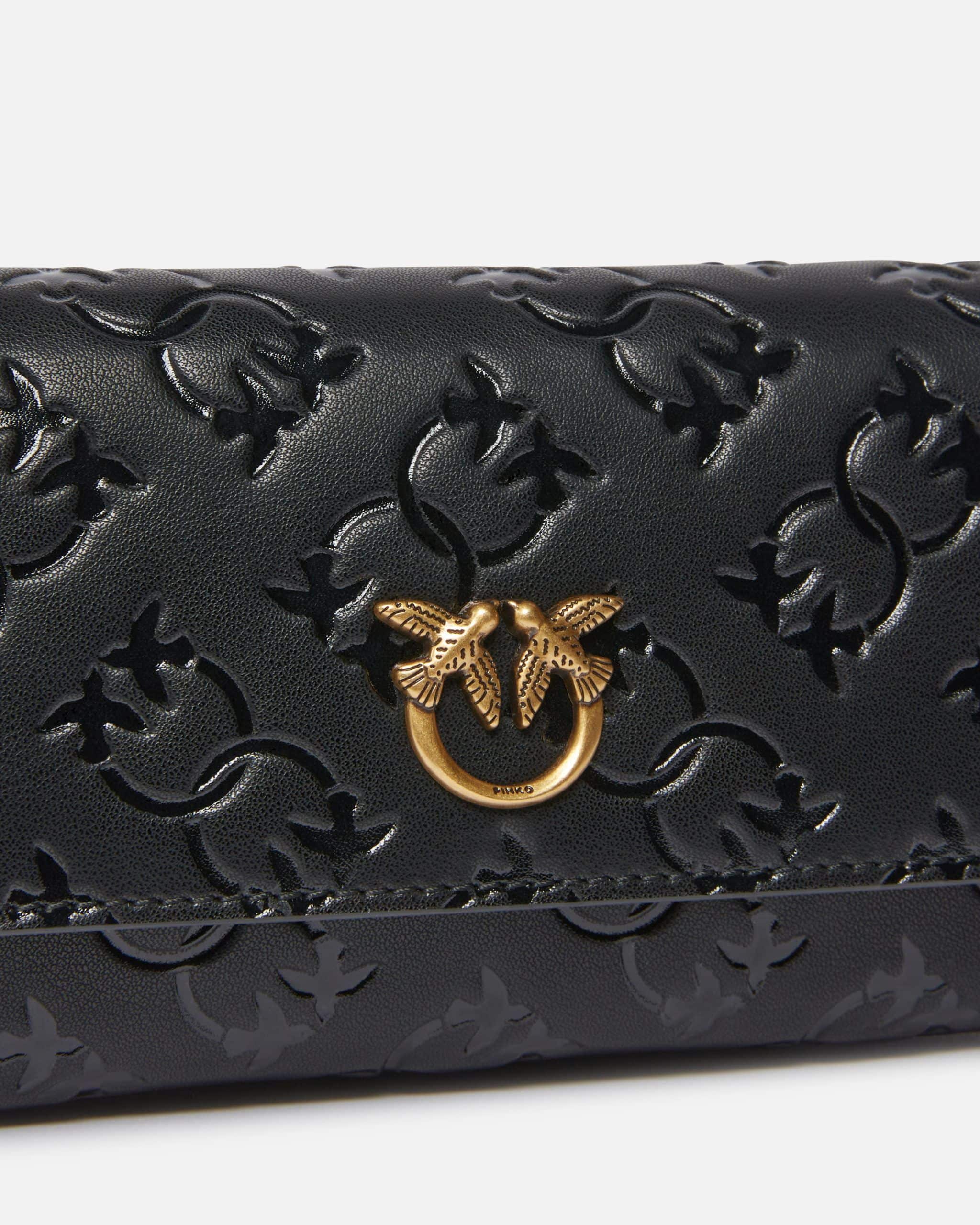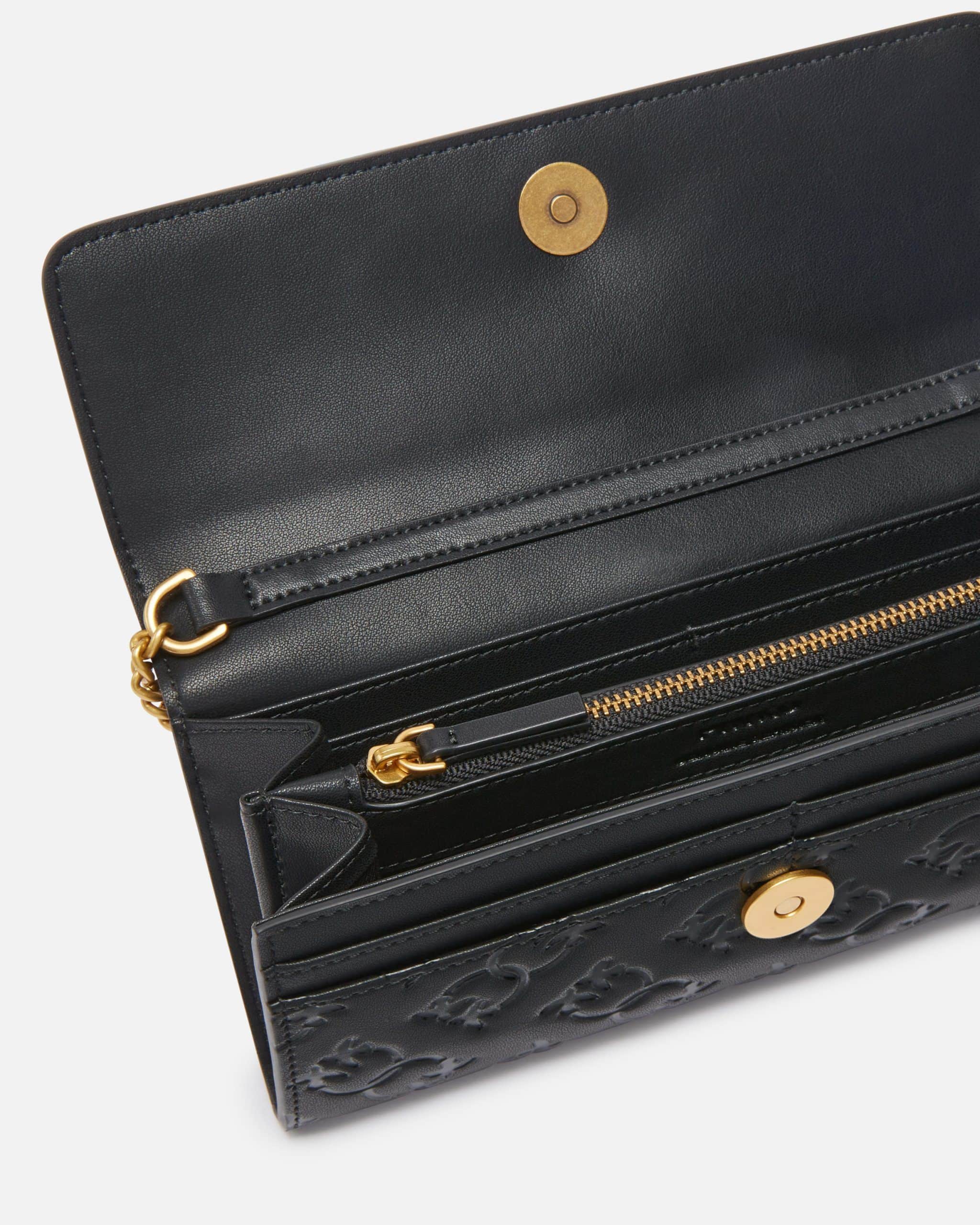 Πορτοφόλι σε ορθογώνιο μακρόστενο σχήμα από δέρμα με μεταξένια υφή, διακοσμημένο με το κέντημα Love Birds Monogram με εμπίεστη τεχνική. Το καπάκι που κλείνει το πορτοφόλι είναι διακοσμημένο με μια μικρή μεταλλική πλάκα με το λογότυπο Love Birds Diamond Cut, ενώ το εσωτερικό με επένδυση από polycotton διαθέτει υποδοχές για πιστωτικές κάρτες και ένα διαχωριστικό που κλείνει με φερμουάρ. Το πρακτικό μεταλλικό λουράκι ώμου από αλυσίδα είναι αφαιρούμενο και σας επιτρέπει να φοράτε το πορτοφόλι στον ώμο, για τις πιο ιδιαίτερες περιστάσεις που απαιτούν έναν ενδυματολογικό κώδικα πιο μελετημένο.