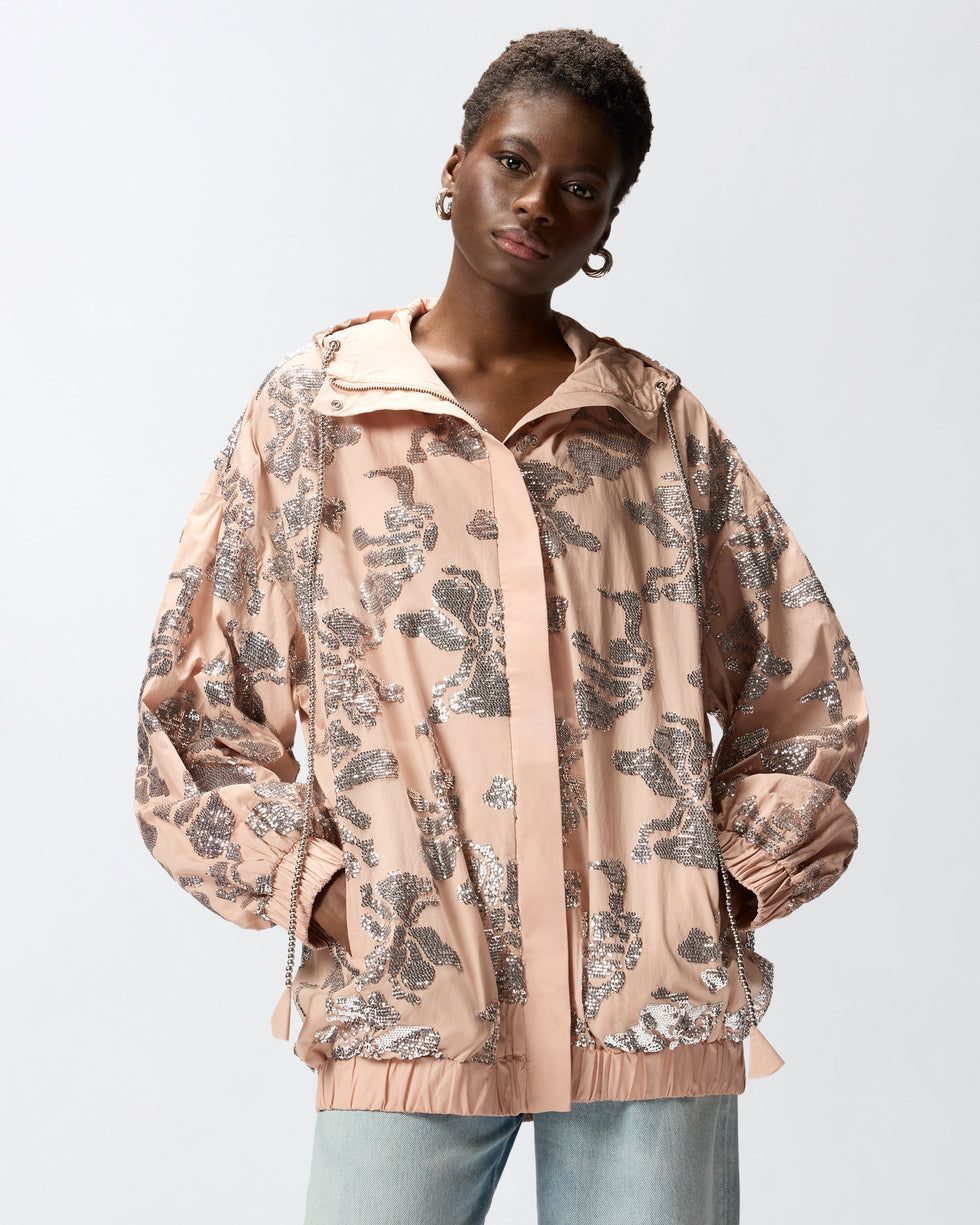 Bomber κατασκευασμένο από απαλή και ανθεκτική τεχνική ποπλίνα, διακοσμημένο σε όλη την επιφάνειά του με εκλεπτυσμένο φλοράλ κέντημα με ασημί παγιέτες, που χαρίζει στο ρούχο λάμψη και αέρινη γοητεία. Διαθέτει ελαστικές μανσέτες και ελαστικό τελείωμα στο κάτω μέρος, κλείσιμο με κρυφό φερμουάρ και κουκούλα ρυθμιζόμενη με κορδόνια με λαμπερές χάντρες και υφασμάτινο στοπάκι. Ο τέλειος συνδυασμός πρακτικότητας και glam στυλ καθιστά αυτό το bomber ένα απαραίτητο κομμάτι για όσες θέλουν να ξεχωρίζουν με κομψότητα ακόμη και στις καθημερινές τους εμφανίσεις.