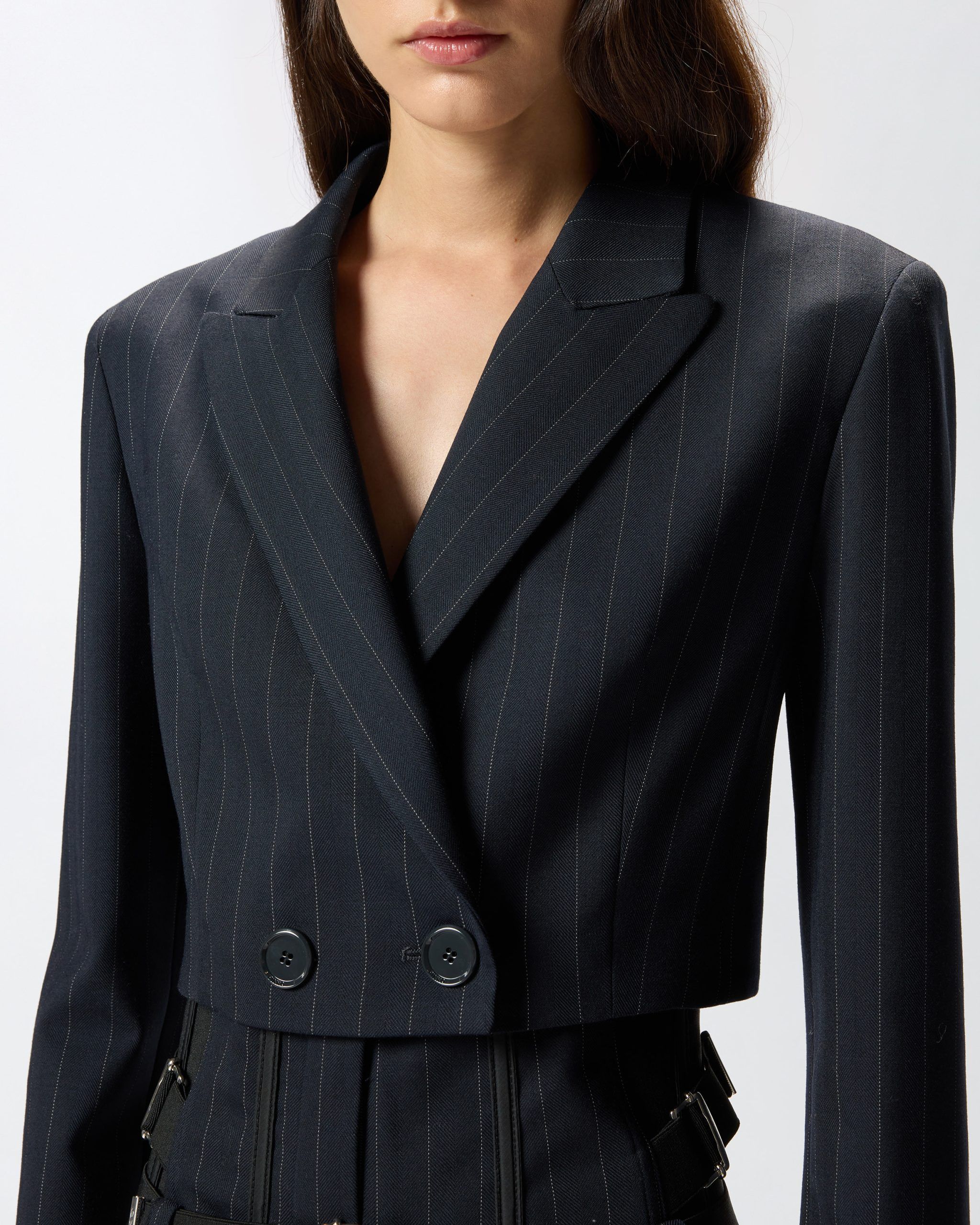 Σταυρωτό σακάκι με κοντή γραμμή σε στυλ spencer, με κλασικό γιακά με πέτο και φόδρα εσωτερικά. Το ύφασμα είναι ένα κλασικό ριγέ πολυεστερικό μάλλινο ύφασμα, που χαρακτηρίζεται από μια εναλλαγή στην υφή και τη λάμψη του, τονίζοντας το σχέδιο του υφάσματος. Το σακάκι spencer είναι ένα απαραίτητο ρούχο που θα πρωταγωνιστήσει στα κομψά και επίσημα σύνολα της νέας σεζόν. Συνδυάστε το με το παντελόνι με το ίδιο μοτίβο για ένα πραγματικά πρωτότυπο και αξέχαστο total look.